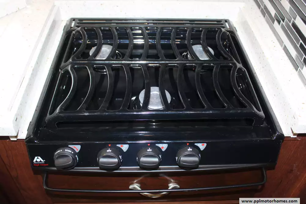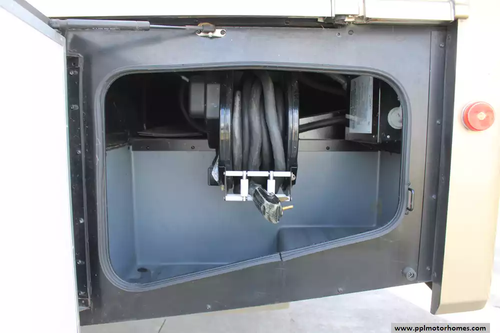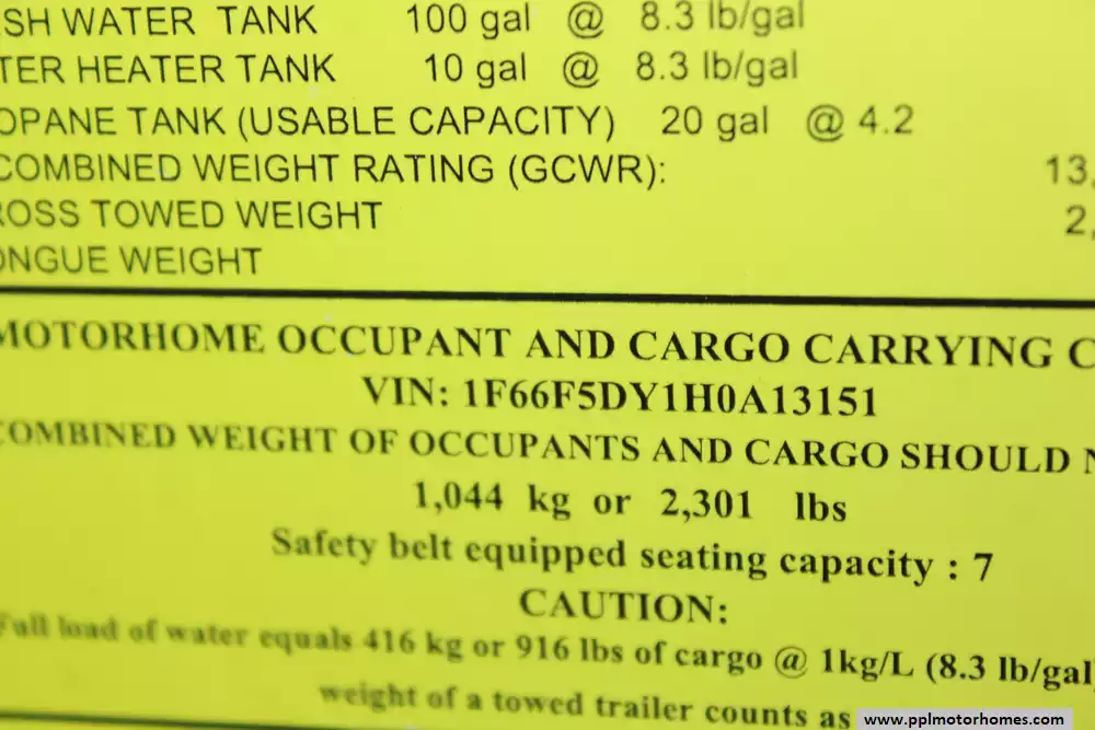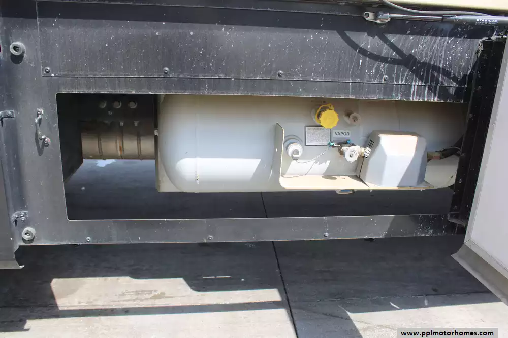 Specs: Length: 36.3 ft., Height: 12.10 ft., Width: 8.5 ft., Interior Height: 7 ft., Interior Width: 8 ft., Fuel Capacity: 80 gal., Total Fresh Water Tank Capacity: 100 gal., Total Gray Water Tank Capacity: 46 gal., Total Black Water Tank Capacity: 30 gal., Total Propane Tank Capacity: 25 gal.
