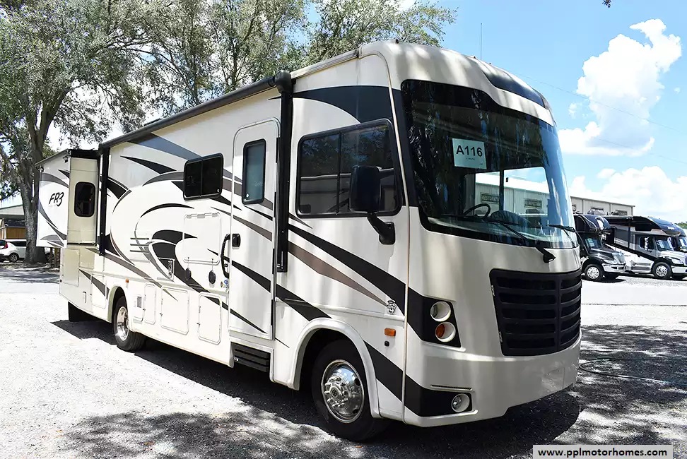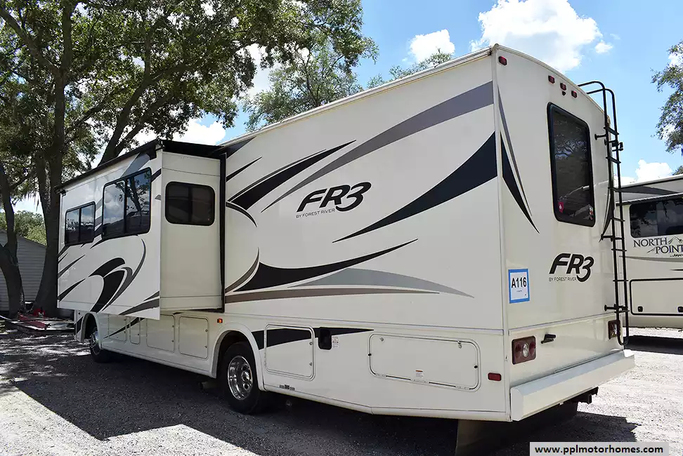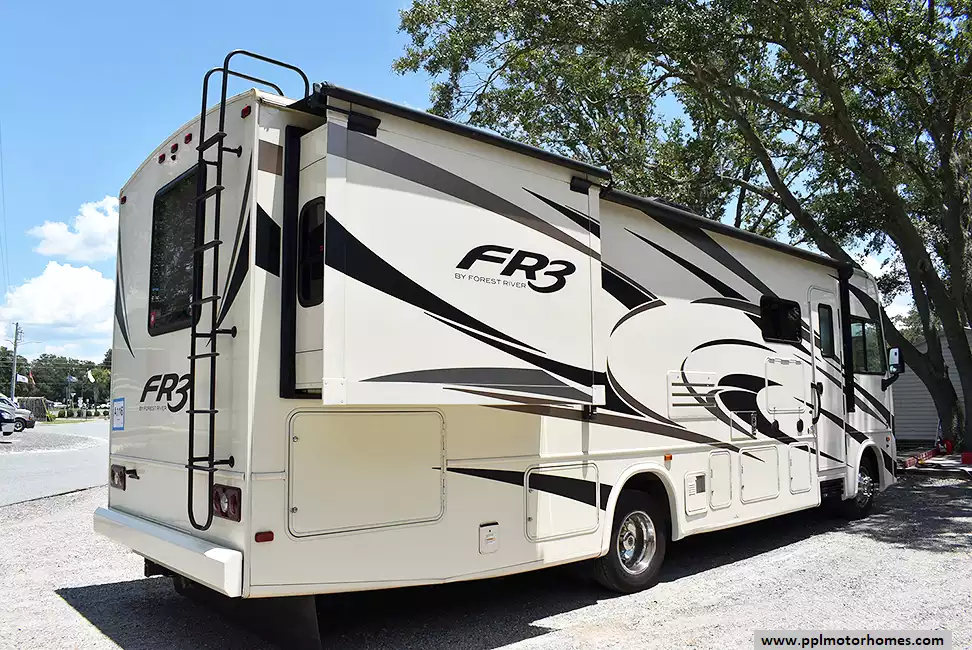 This 2018 FR3 30DS has a Triton / V10 Ford Engine On a Ford Chassis, 2 Slide-outs, Onan Gas Generator, 2 Ducted Air Conditioners, Levelers, 4 Door Gas/110v Norcold Refrigerator, Automatic Main Awning And Slide Awning, Backup Camera, Heated Tanks, Outside Entertainment System, 3 TVs, Outside Shower, Convection Microwave, 3 Burner Range, Oven