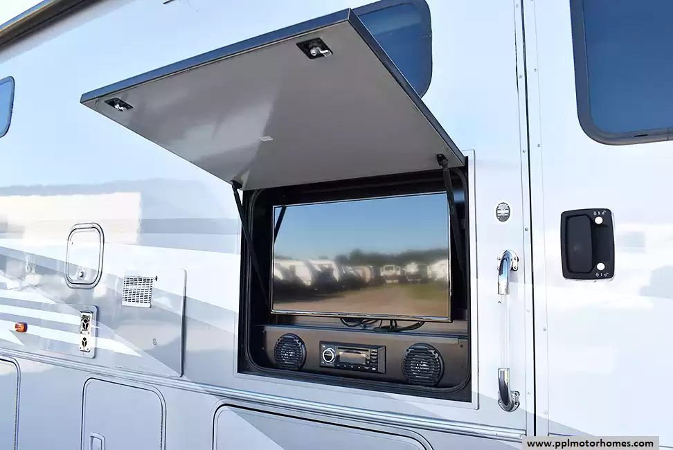 This 2019 Adventure 35F has a V10 6.8l Ford Engine On a Ford Chassis, 2 Slide-outs, Onan Gas Generator, 2 Ducted Air Conditioners, Levelers, Double Door Residential Whirlpool Refrigerator, In-Fridge Ice Maker, Automatic Main Awning And Slide Awning, Washer/Dryer, Backup Camera, Satellite Receiver, Outside Entertainment System, 3 TVs, Outside Shower, Fireplace, Convection Microwave, 3 Burner Range