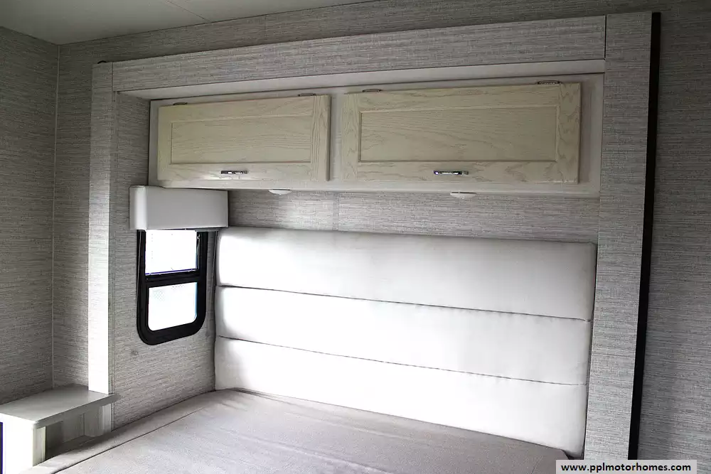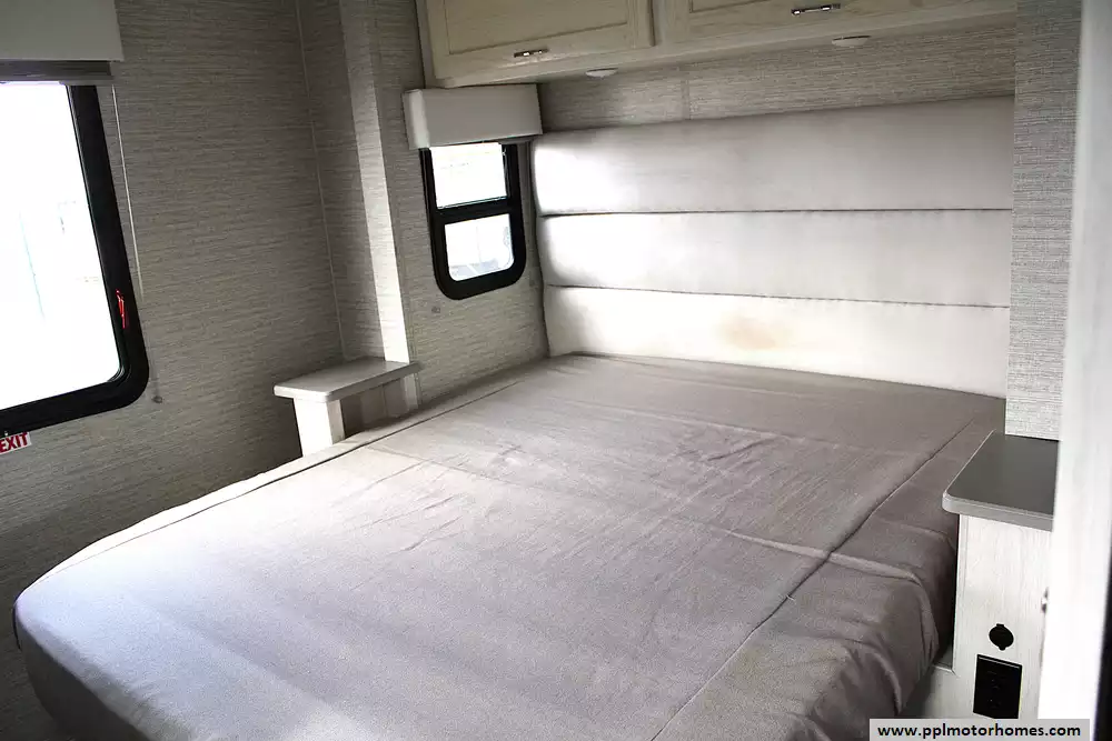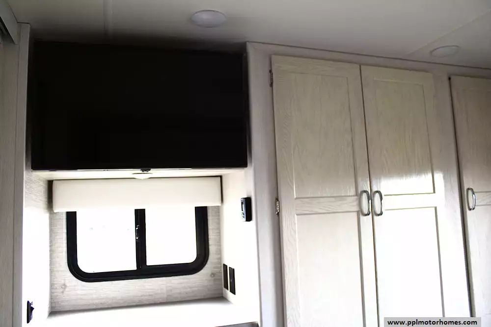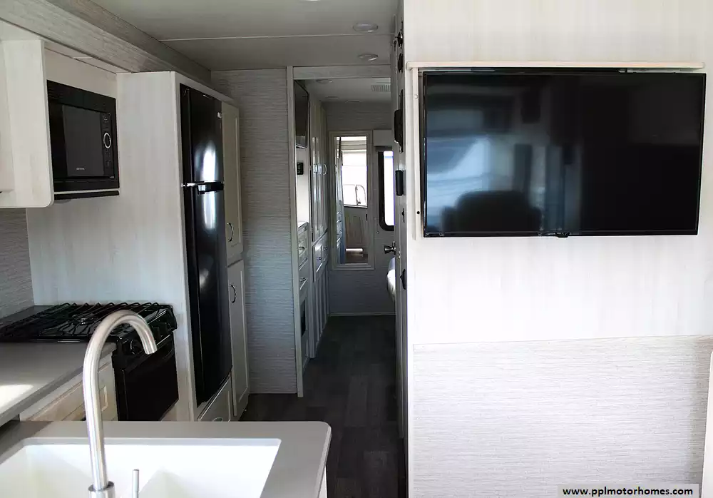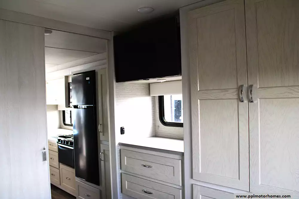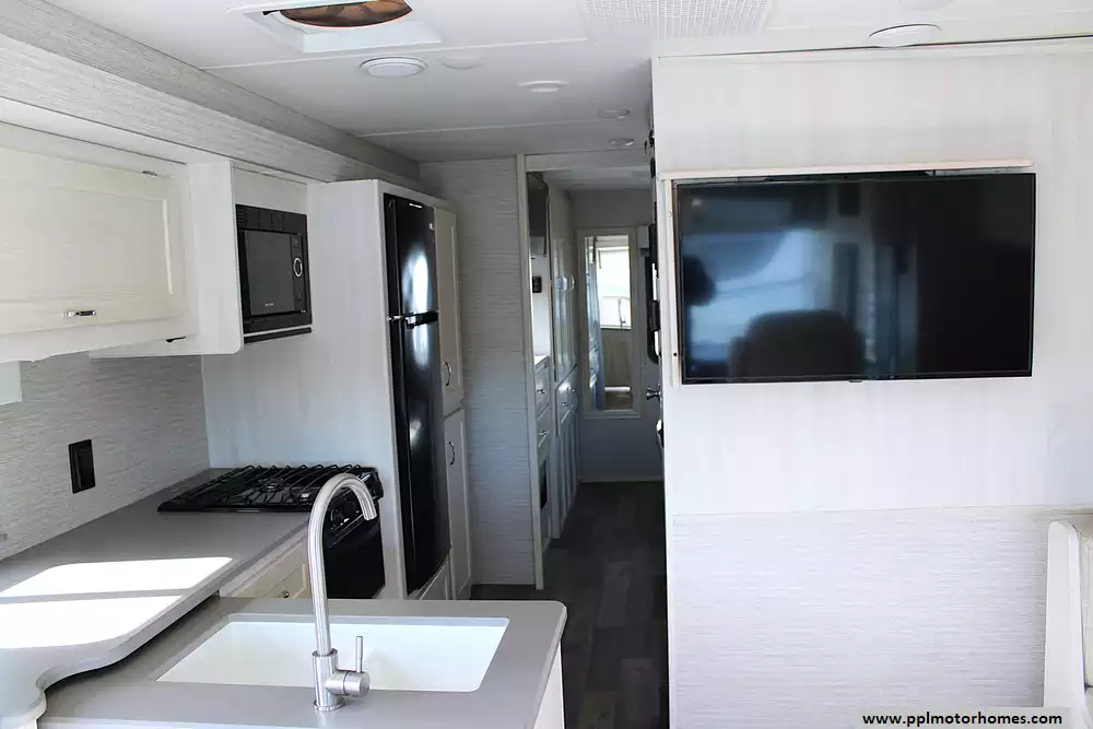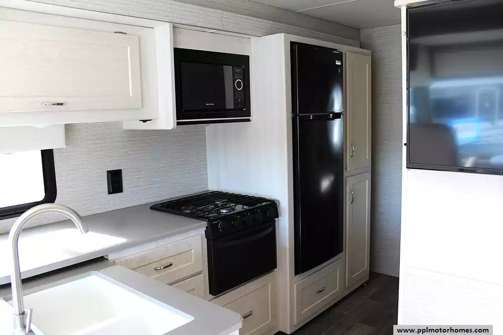 Inside, this coach sleeps up to 6 thanks to a private rear queen bedroom, the innovative StudioLoft power overhead bed, and a convertible dinette. The bright, modern interior features vinyl flooring, LED lighting, solid-surface kitchen countertops, and plenty of storage throughout. The kitchen is fully equipped with a residential-style refrigerator, three-burner cooktop with oven, microwave, and generous pantry space--making meal prep easy whether you're camping for a weekend or traveling cross-country.