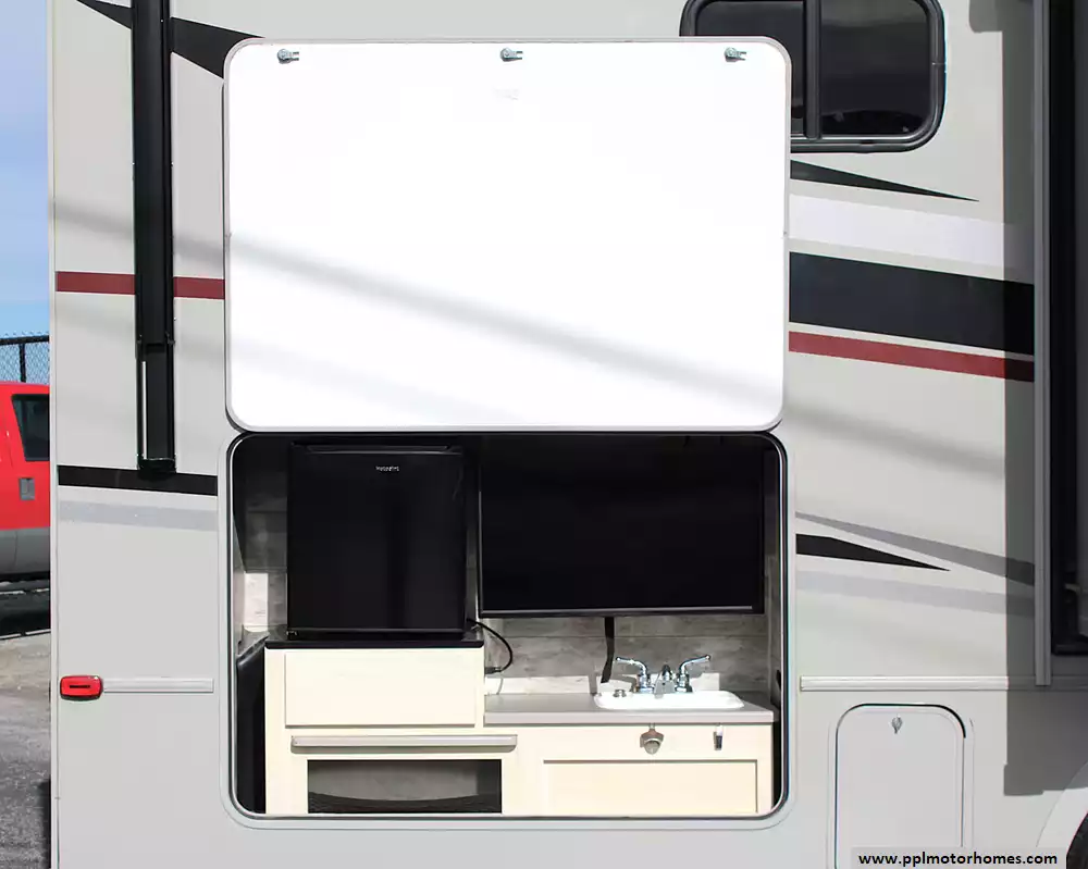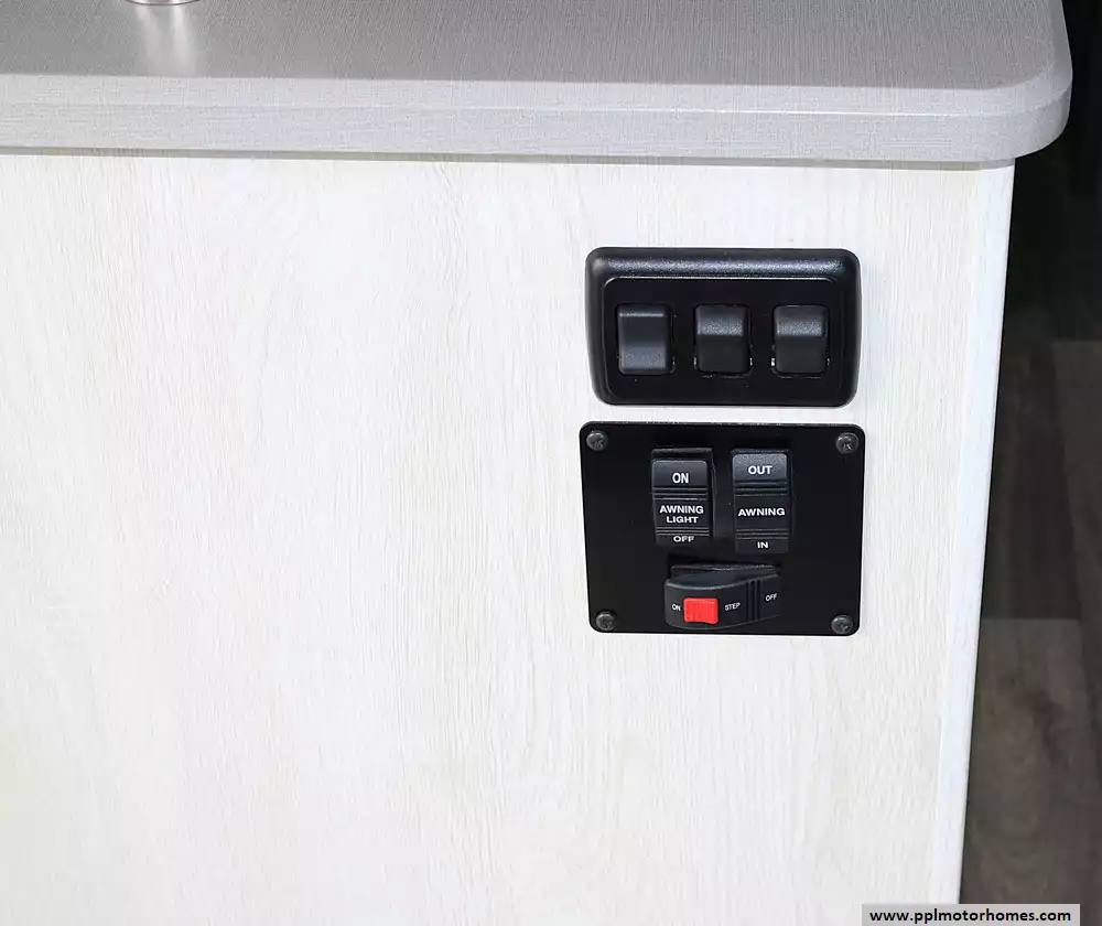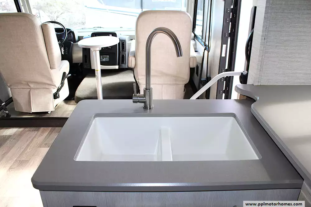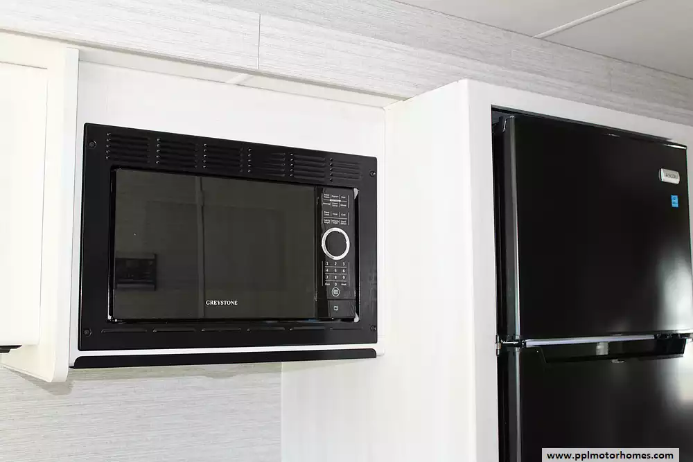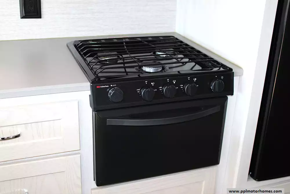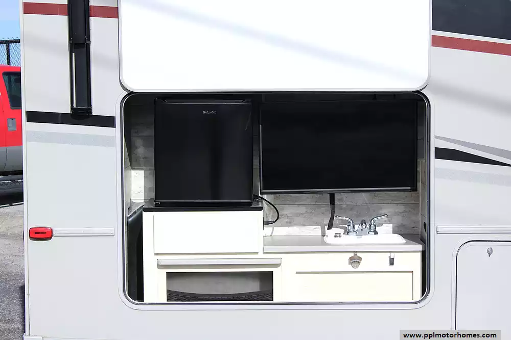 Inside, this coach sleeps up to 6 thanks to a private rear queen bedroom, the innovative StudioLoft power overhead bed, and a convertible dinette. The bright, modern interior features vinyl flooring, LED lighting, solid-surface kitchen countertops, and plenty of storage throughout. The kitchen is fully equipped with a residential-style refrigerator, three-burner cooktop with oven, microwave, and generous pantry space--making meal prep easy whether you're camping for a weekend or traveling cross-country.