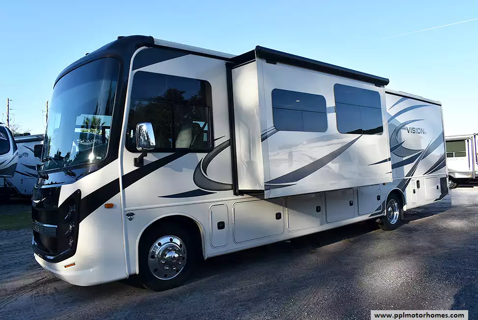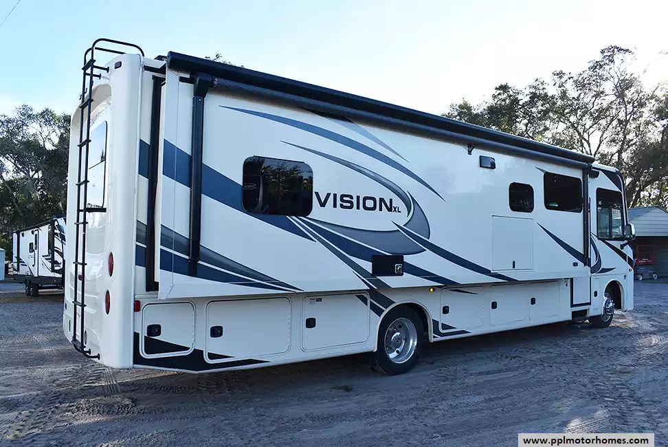 This 2022 Vision Xl 34G has a V8 Ford Engine On a Ford Chassis, 2 Slide-outs, Onan Gas Generator, 2 Ducted Air Conditioners, Levelers, Double Door Residential Whirlpool Refrigerator, In-Fridge Ice Maker, Automatic Main Awning And Window/Slide/Door Awnings, Washer/Dryer Connections, Backup Camera, Solar Panel, Heated Tanks, Satellite Receiver, Outside Entertainment System, 3 TVs, Outside Shower, Fireplace, Microwave, 3 Burner Range, Oven