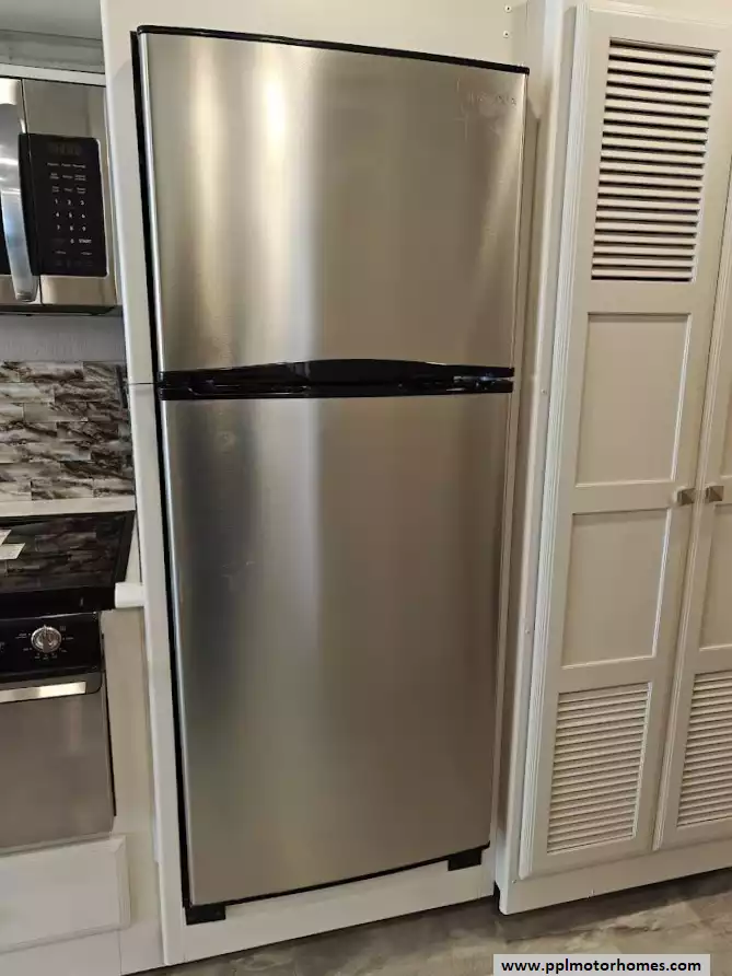 The kitchen area is equipped with a residential stainless steel refrigerator, solid surface countertops, a convection microwave, a 3 burner range and oven.