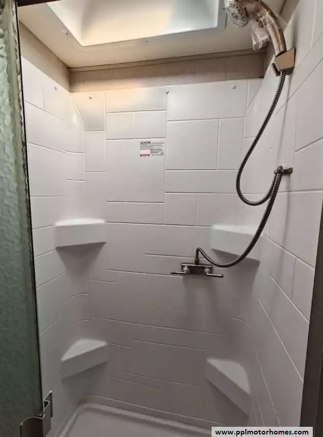 In the bathroom, you'll find a glass-enclosed shower with an ABS shower surround. The shower has a metal head with an adjustable sliding bar, a soap dish, and a skylight for additional light. It also comes equipped with a porcelain toilet, a sink and vaniety and a mirrored medicine cabinet provides storage for toiletries.