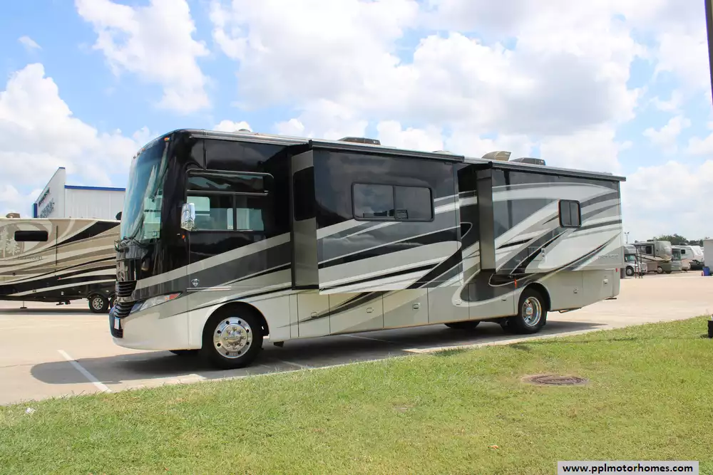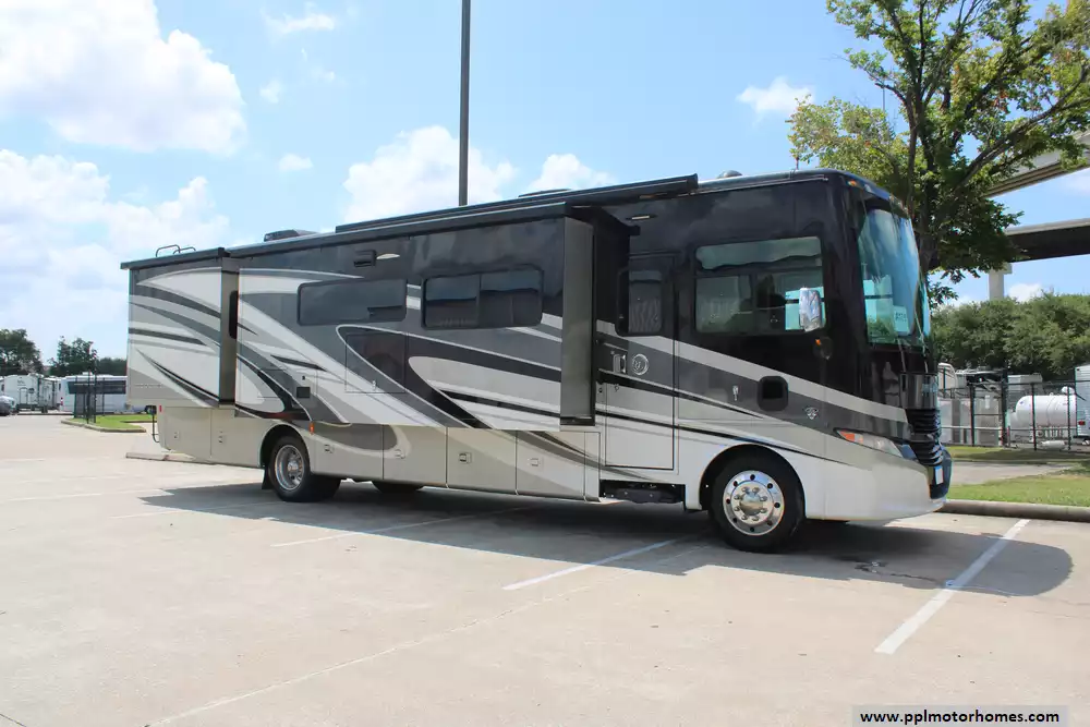 Specs: Length: 36.08 ft., Width: 8.42 ft., Height: 12.83 ft., Interior Height: 7 ft., Fuel Capacity: 80 gal., Total Fresh Water Tank Capacity: 70 gal., Total Gray Water Tank Capacity: 66 gal., Total Black Water Tank Capacity: 50 gal., Number of Propane Tanks: 1, Total Propane Tank Capacity: 102 lbs.