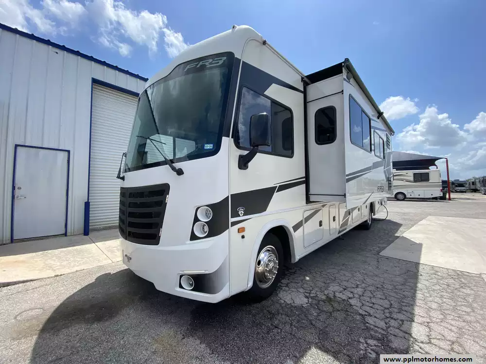 This 2022 FR3 33DS has a V-8 5.4l Ford Engine On a Ford Chassis, 2 Slide-outs, Gas Generator, 2 Ducted Air Conditioners, Levelers, 4 Door Gas/110v Norcold Refrigerator, Automatic Main Awning And Slide Awning, Washer/Dryer, Backup Camera, GPS System, Solar Panel, Heated Tanks, Outside Entertainment System, 2 TVs, Satellite Radio, Outside Shower, Fireplace, Microwave, 3 Burner Range, Oven