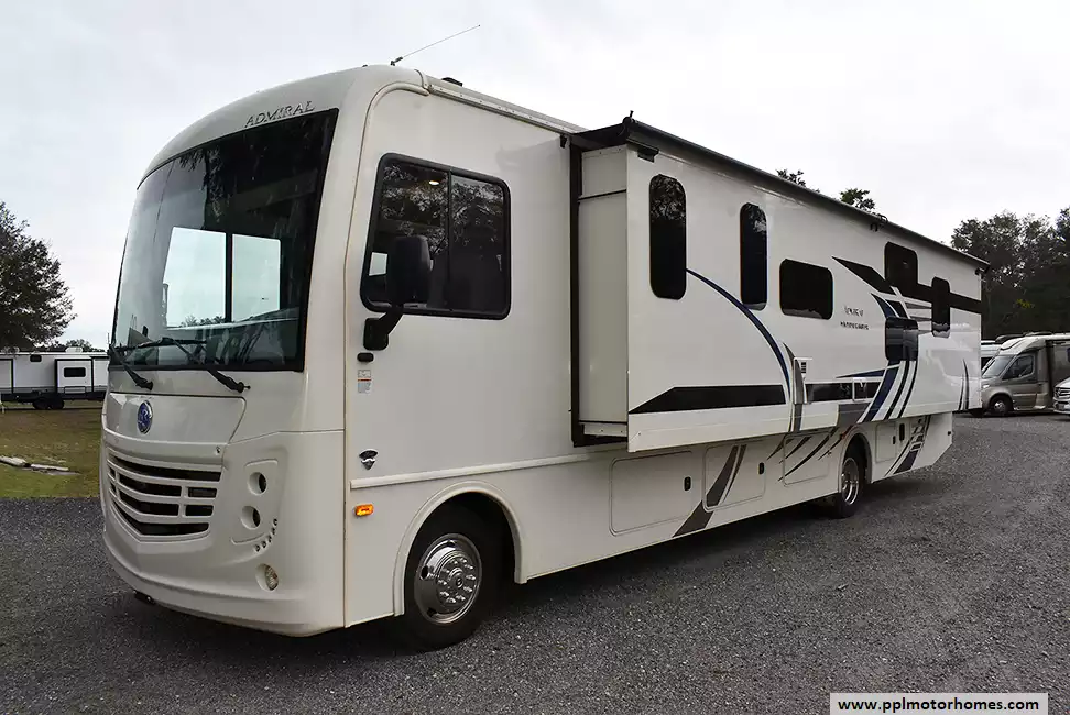 This 2022 Holiday Rambler Admiral 34J has a 6.8l Ford Engine On a Ford Chassis, 1 Slide-out, Onan Gas Generator, 2 Ducted Air Conditioners, Levelers, Double Door 12v Insignia Refrigerator, Automatic Main Awning And Slide Awning, Backup Camera, Satellite Receiver, Outside Entertainment System, 3 TVs, DVD Player, Outdoor Kitchen, Outside Shower, Microwave, 3 Burner Range