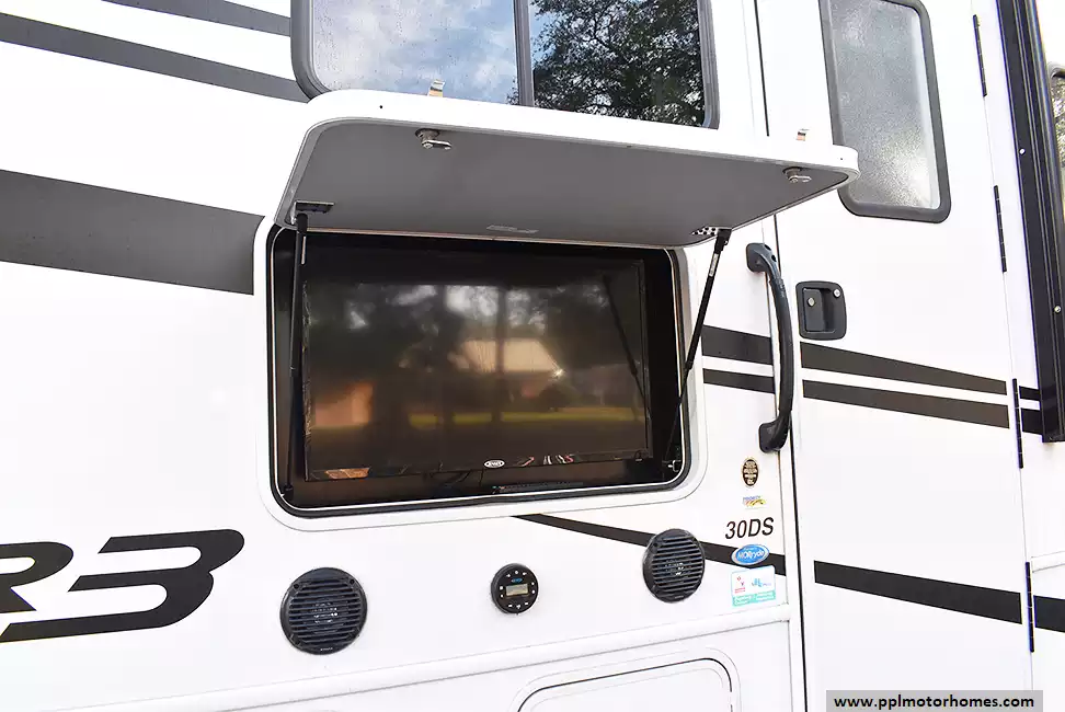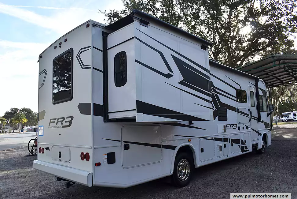 This 2023 FR3 30DS has a 7.3 V8 Ford Engine On a Ford Chassis, 2 Slide-outs, Gas Generator, 2 Ducted Air Conditioners, Levelers, 4 Door Gas/110v/12v Norcold Refrigerator, Automatic Main Awning And Slide Awning, Washer/Dryer, Backup Camera, GPS System, Solar Panel, Satellite Receiver, Outside Entertainment System, 3 TVs, Satellite Radio, Outside Shower, Microwave, 3 Burner Range, Oven