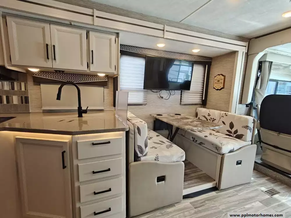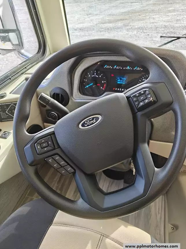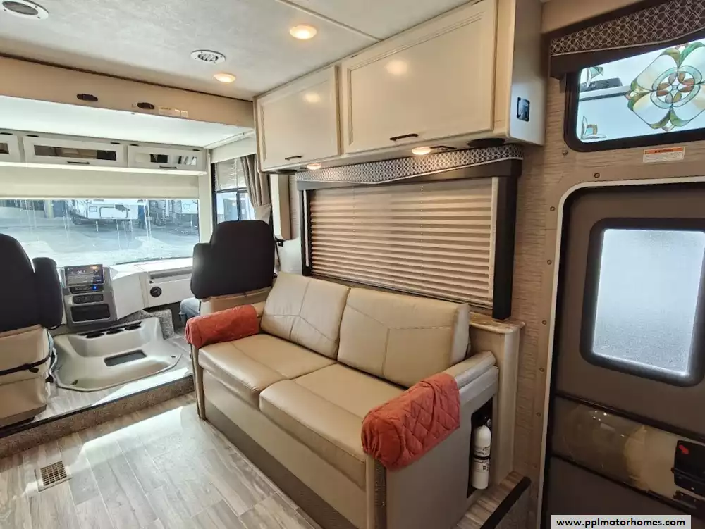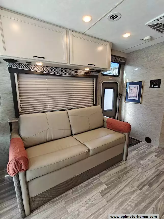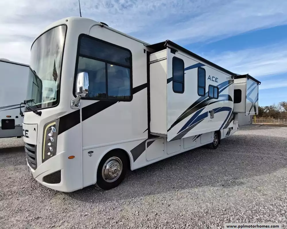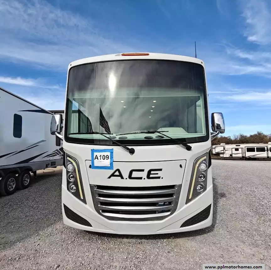 The 2023 Thor A.C.E. 30C is a gas-powered Class A motorhome built on a Ford F-53 chassis - extremely well cared for. It is known for its practical, family-friendly floorplan that features two slide-outs, a rear king-size bed, a leatherette jack-knife sofa, a Dream Dinette booth that converts to a bed. and a drop-down bunk over the cab. It is equipped for both indoor and outdoor living, with an exterior kitchen and entertainment center. The A.C.E. is equipped with a 10-in touchscreen dash radio that is Bluetooth, Android AutoT, and Apple CarPlayr ready. It is also equipped with a comprehensive camera system that includes a back-up camera and integrated side-view cameras. Features a GE double-door refrigerator, a three-burner gas cooktop and oven with a glass cover, a microwave, a double-bowl stainless steel sink, and solid-surface countertops.The unit comes with automatic leveling jacks with touchpad controls and enclosed and heated holding tanks, tanks from freezing in colder temperatures. The exterior mirrors are heated, which improves visibility and safety in freezing conditions. It comes with a power patio awning with integrated LED lighting, an exterior LP connection, basement storage, and a "Pet-Link" multi-purpose tie-down. Other features include 400H 12V lithium battery, sumo spring, sway bar, steering stabilizer, auto leveling with pads, Winegard 360, WiFi booster and 100 watt solar panel, underbelly has been sprayed with rust resistant. Owners recently replaced the back AC, slide toppers, toilet and charging station.