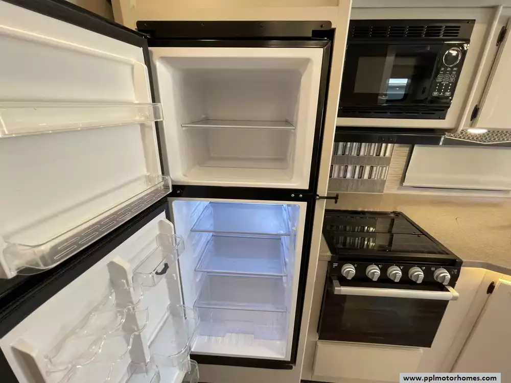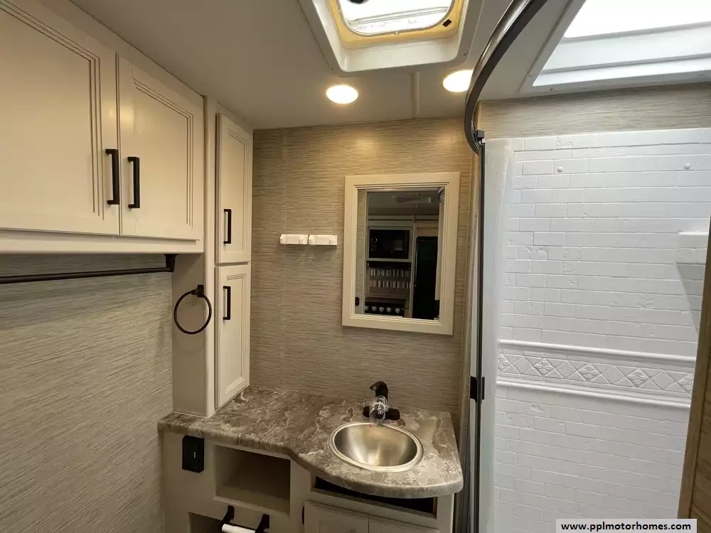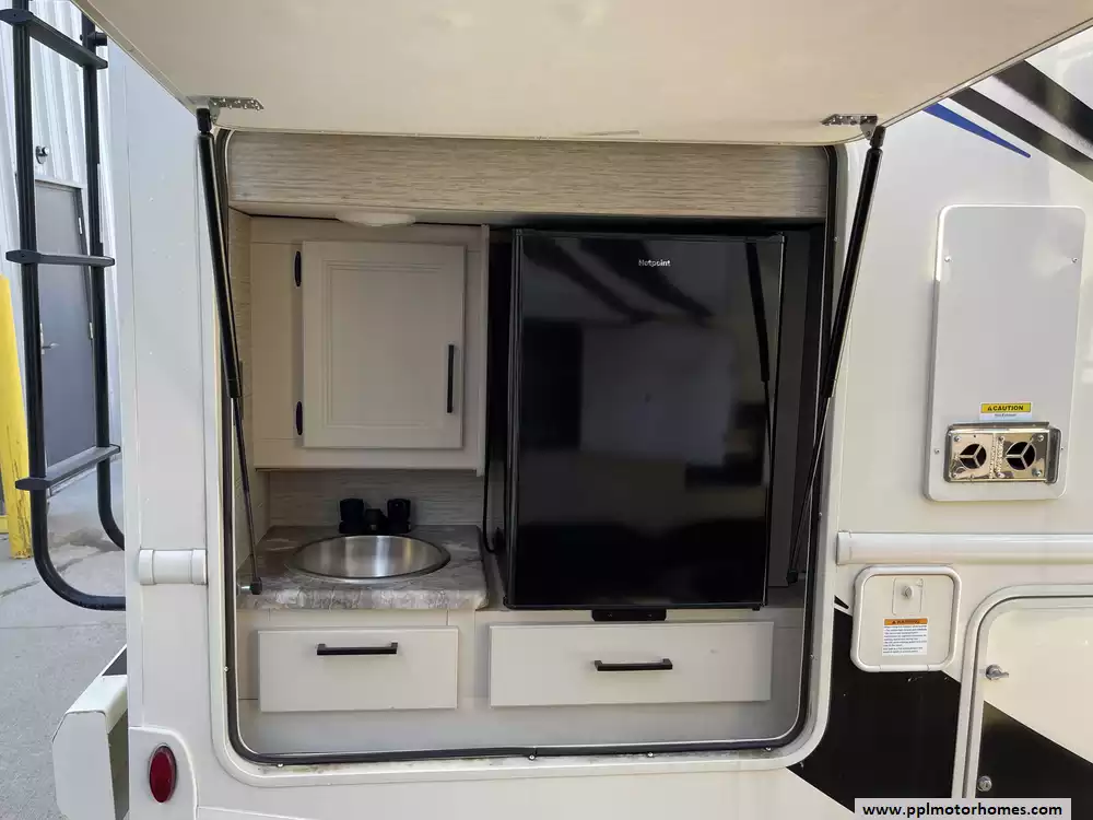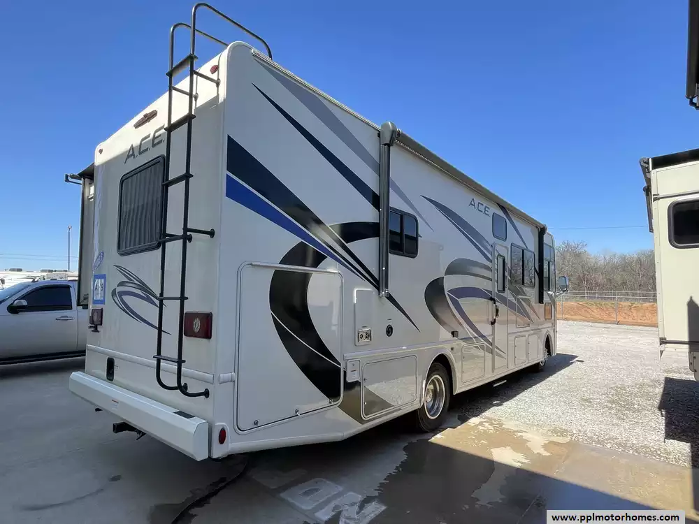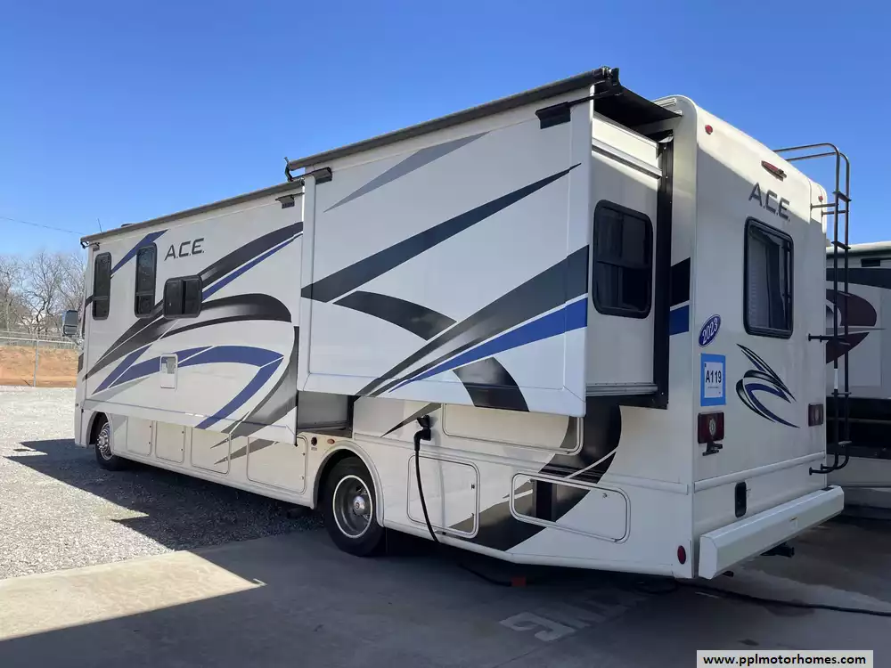 This 2023 A.C.E. Series 30C has a 2 Slide-outs, Onan Generator, 2 Ducted Air Conditioners, Levelers, Double Door 12v Ge Refrigerator, Automatic Main Awning And Window/Door Awnings, 3 TVs, Outside Shower, Microwave, 3 Burner Range, Oven, Heated Side Mirrors, Built on Ladder, Window Escape Ladder for Bedroom, Outdoor TV, fridge and Sink