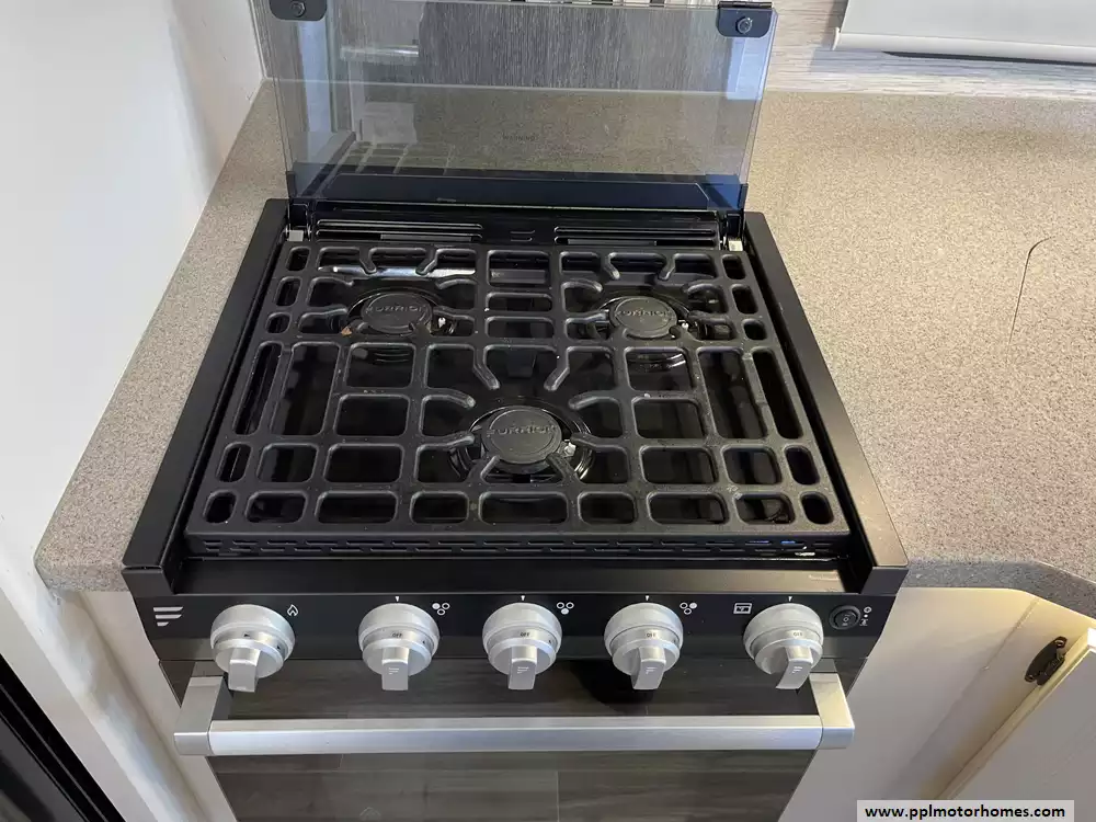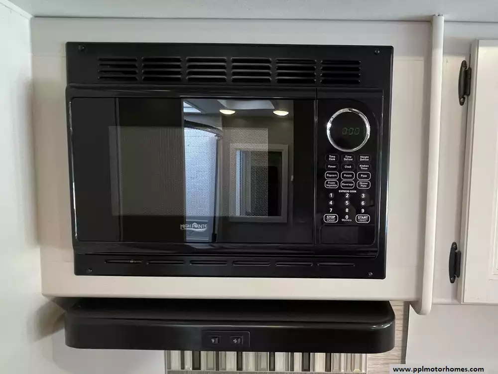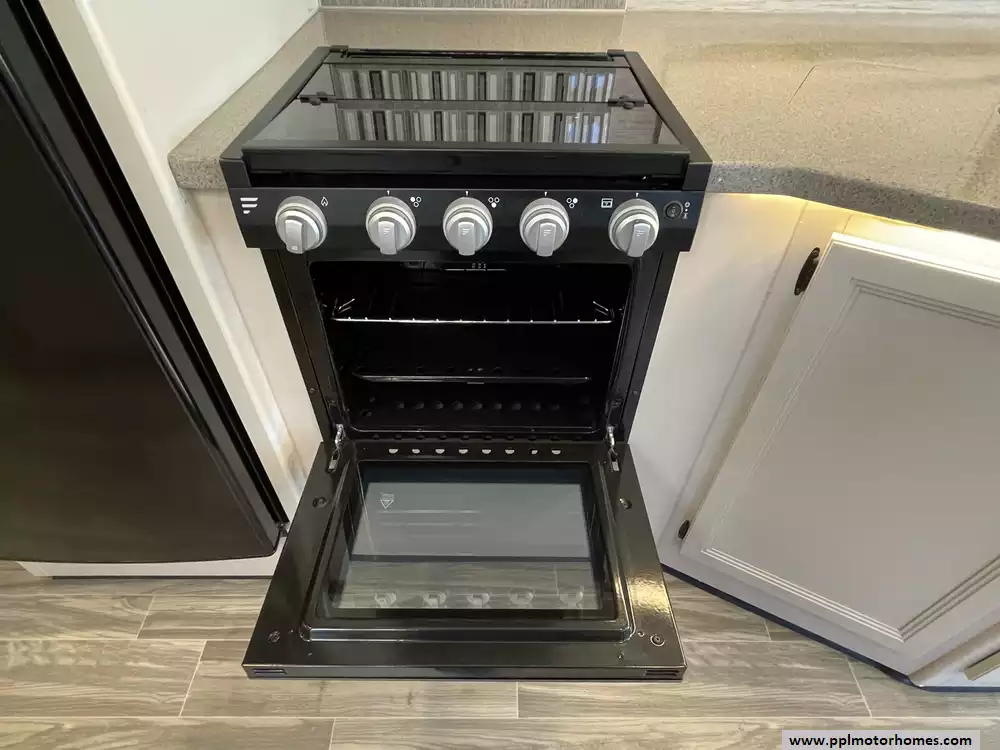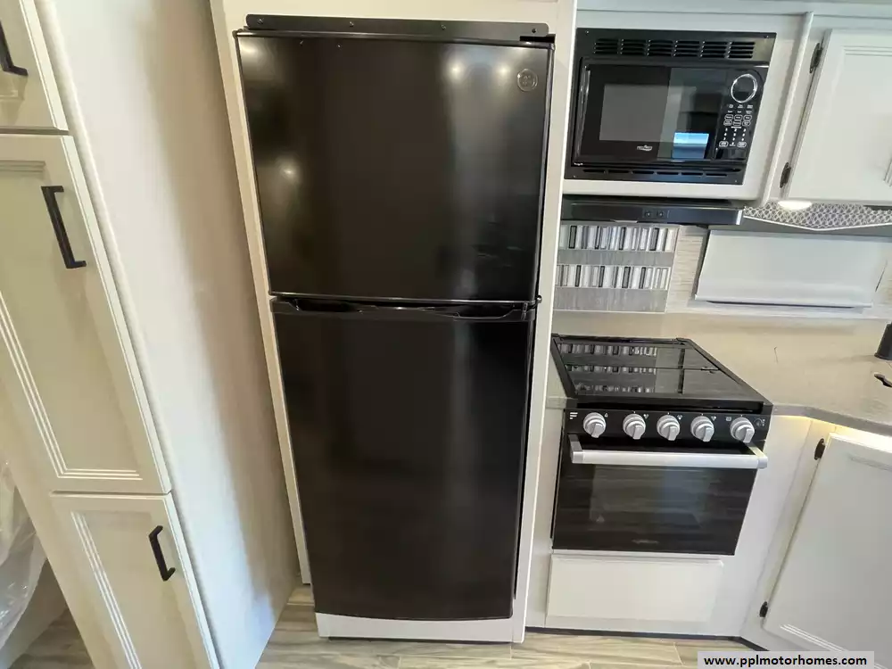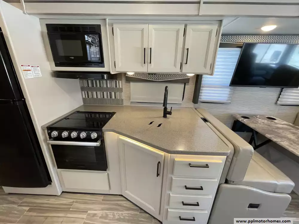 This 2023 A.C.E. Series 30C has a 2 Slide-outs, Onan Generator, 2 Ducted Air Conditioners, Levelers, Double Door 12v Ge Refrigerator, Automatic Main Awning And Window/Door Awnings, 3 TVs, Outside Shower, Microwave, 3 Burner Range, Oven, Heated Side Mirrors, Built on Ladder, Window Escape Ladder for Bedroom, Outdoor TV, fridge and Sink