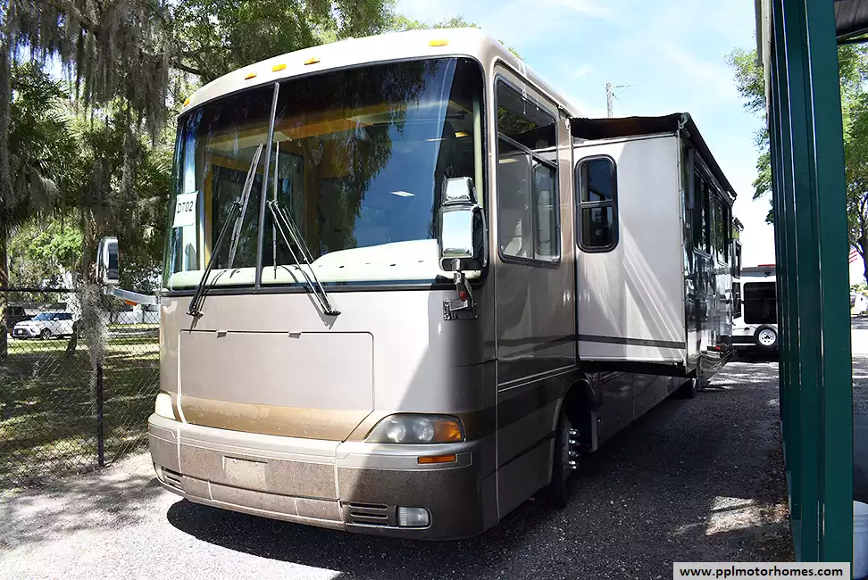 This 2002 Dutchstar by Newmar 4097 has a 350hp Cummins Engine On a Spartan Chassis, Air Ride Suspension, Exhaust Brake, 3 Slide-outs, Onan Diesel Generator, 2 Ducted Air Conditioners, Levelers, Double Door 12v Everchill Refrigerator, Automatic Main Awning And Window/Slide/Door Awnings, Washer/Dryer, Backup Camera, 2 TVs, DVD Player, Outside Shower, Fireplace, Convection Microwave, 3 Burner Range