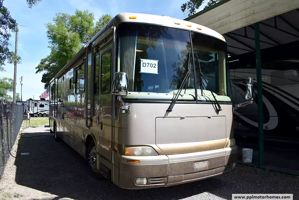 This 2002 Dutchstar by Newmar 4097 has a 350hp Cummins Engine On a Spartan Chassis, Air Ride Suspension, Exhaust Brake, 3 Slide-outs, Onan Diesel Generator, 2 Ducted Air Conditioners, Levelers, Double Door 12v Everchill Refrigerator, Automatic Main Awning And Window/Slide/Door Awnings, Washer/Dryer, Backup Camera, 2 TVs, DVD Player, Outside Shower, Fireplace, Convection Microwave, 3 Burner Range