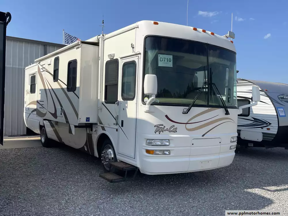 This 2004 Tropi-Cal by National RV 350 has a 330hp CAT Engine On a Freightliner Chassis, 3 Slide-outs, Diesel Generator, 2 Ducted Air Conditioners, Levelers, Double Door Gas/110v Dometic Refrigerator, In-Fridge Ice Maker, Automatic Main Awning And Slide Awning, Backup Camera, Outside Speakers, 2 TVs, Convection Microwave, 3 Burner Range, Oven