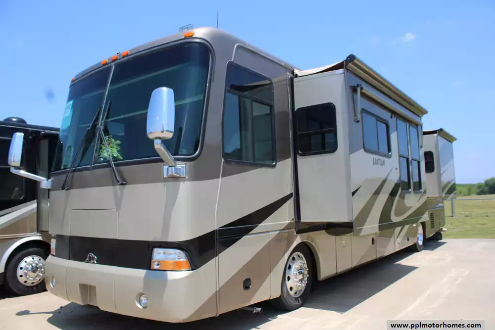 The 2005 Beaver Santiam 40PDQ is a premium Class A diesel motorhome built on a durable Roadmaster raised-rail chassis and boasting either a 350 HP Caterpillar C-7 engine with Allison transmission, or in some listings, a 400 HP variant. Stretching approximately 40 ft and featuring four slide-outs, the coach offers expansive living space and functional layout enhancements. Inside, you'll find upscale touches like real maple wood cabinetry, solid-surface counters, ceramic tile floors, convection microwave, dual ducted air conditioners, solid-surface countertops, and possibly dual-pane windows and blackout shades depending on the configuration. It also includes practical amenities such as an 8 kW Onan generator, inverter, external shower, 10,000 lb hitch, full body paint, power leveling jacks, pass-through storage, and power-enhanced features like heated mirrors, power-visors, pedals, and window/door awnings. Overall, the Santiam 40PDQ delivers a compelling blend of comfort, quality construction, and capability for long-haul travelers who want a "home away from home."