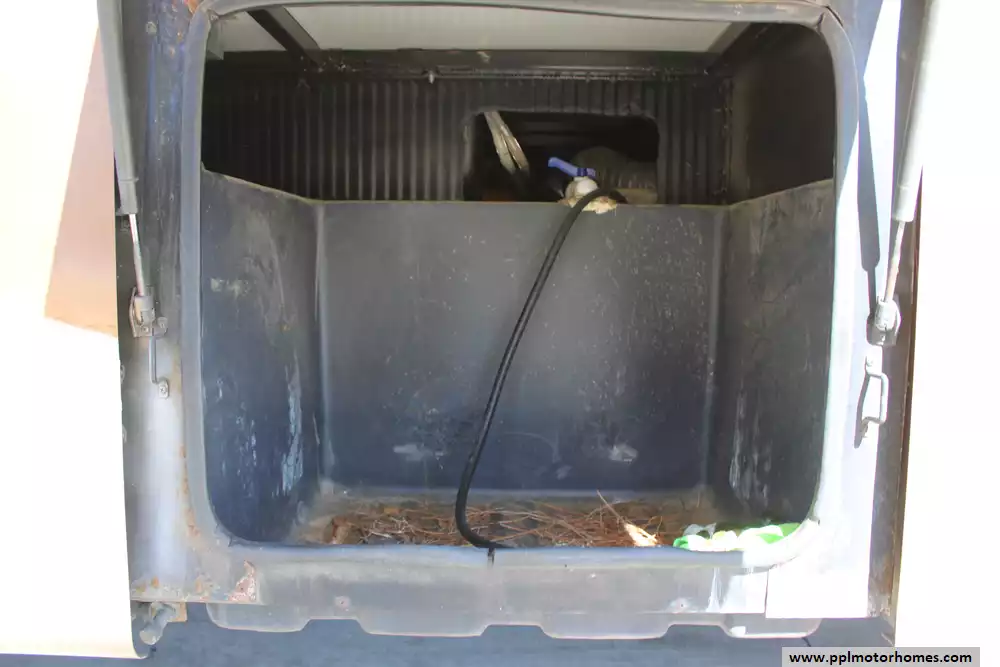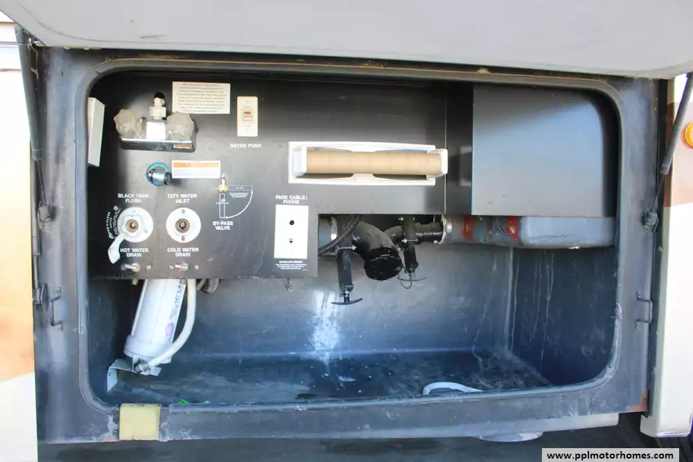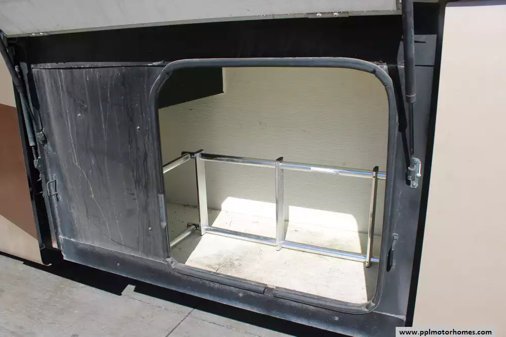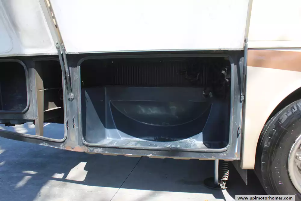 Specs: Length: 38.4 ft., Width: 8.5 ft., Height: 12.1 ft., Interior Height: 6.58 ft., Interior Width: 8 ft., Fuel Capacity: 90 gal., Total Fresh Water Tank Capacity: 86 gal., Total Gray Water Tank Capacity: 50 gal., Total Black Water Tank Capacity: 50 gal., Propane Tank Capacity: 25 gal.