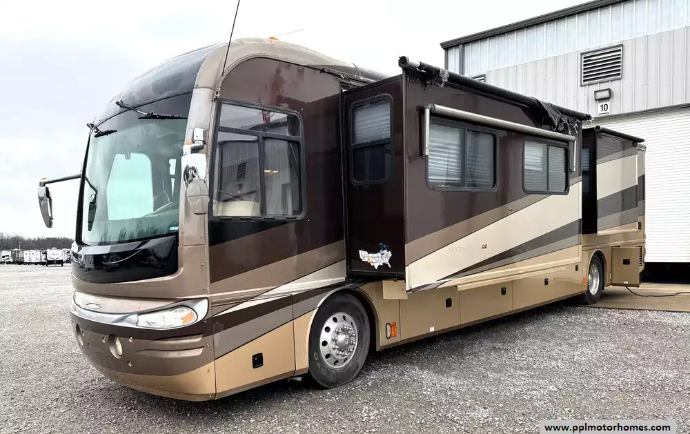 This 2005 Revolution Le 40E has a 400hp 8.8L C9 Caterpillar Liberty Chassis Engine, Exhaust Brake, 3 Slide-outs, Diesel Generator, 2 Ducted Air Conditioners, Levelers, 110v Residential Samsung Refrigerator, In-Fridge Ice Maker, Automatic Main Awning And Slide/Door Awnings, Washer/Dryer, Backup Camera, Outside Entertainment System, 2 TVs, DVD Player, Outside Shower, Convection Microwave, 3 Burner Range