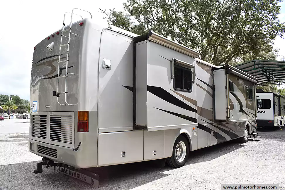 This 2005 Holiday Rambler Endeavor 40PDQ has a 400hp Cummins Engine On a Roadmaster Chassis, Air Bag Suspension, Exhaust Brake, 4 Slide-outs, Onan Diesel Generator, 2 Ducted Air Conditioners, Levelers, 4 Door Gas/110v Norcold Refrigerator, Automatic Main Awning And Window/Slide Awnings, Washer/Dryer, Backup Camera, TV, DVD Player, Outside Shower, Convection Microwave, 3 Burner Range