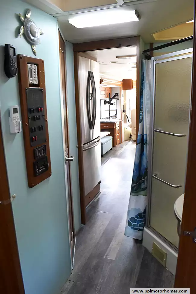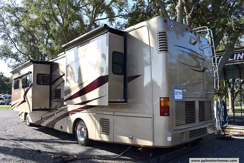 This 2005 Endeavor Series 38PDQ has a 350hp Cummins Engine On a Roadmaster Chassis, Mor Ryde Suspension, Exhaust Brake, 4 Slide-outs, Onan Diesel Generator, 2 Ducted Air Conditioners, Levelers, Residential Samsung Refrigerator, In-Fridge Ice Maker, Main/Window/Slide/Door Awnings, Washer/Dryer, Backup Camera, Solar Panel, TV, Outside Shower, Convection Microwave, 3 Burner Range