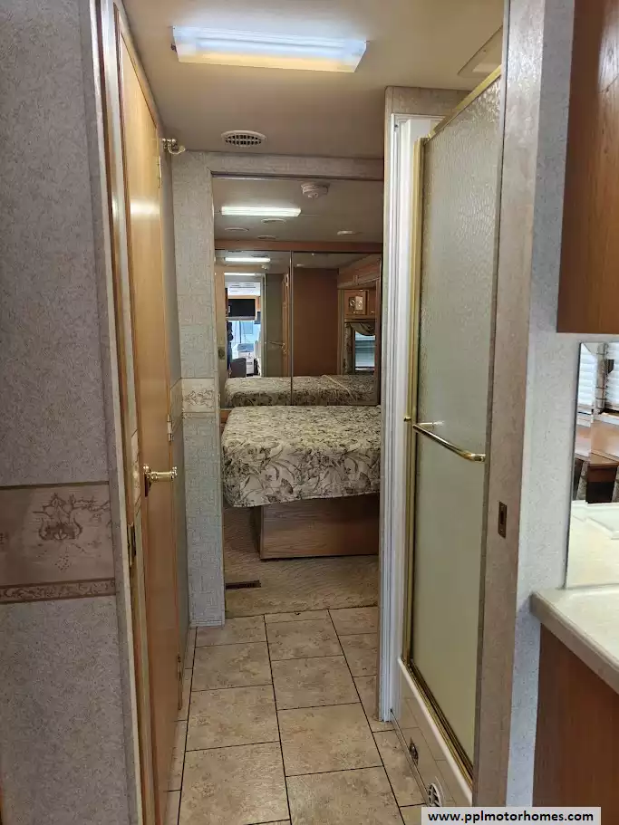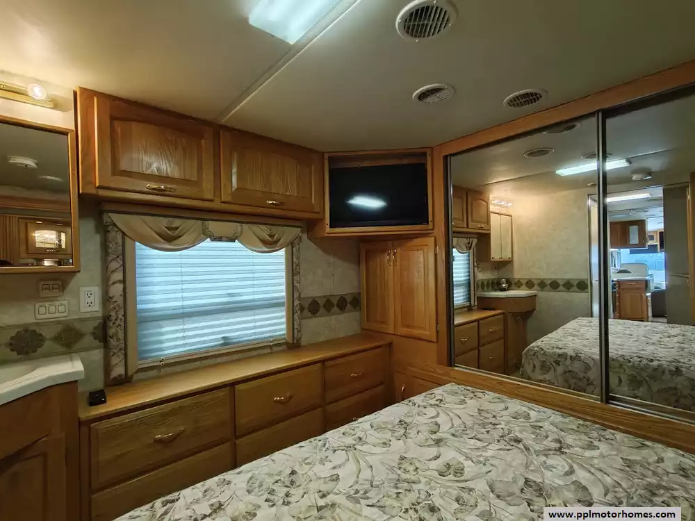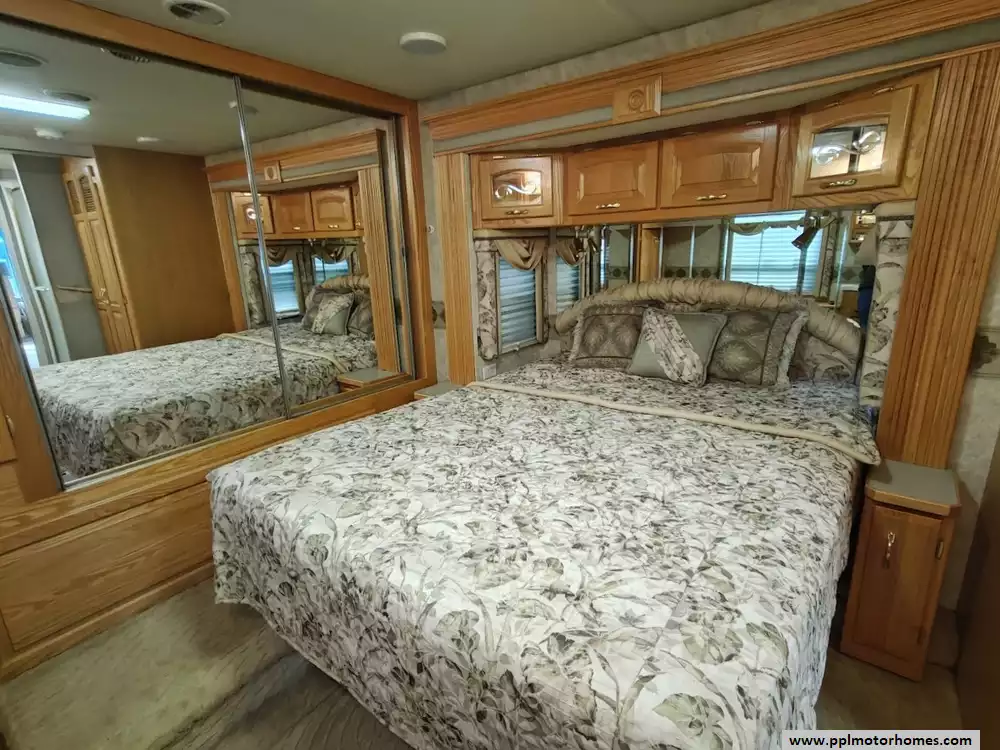 The rear of the coach is the master suite, featuring a walk-around queen-size bed and ample wardrobe and closet space along the back wall.