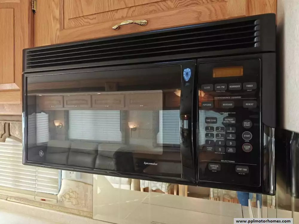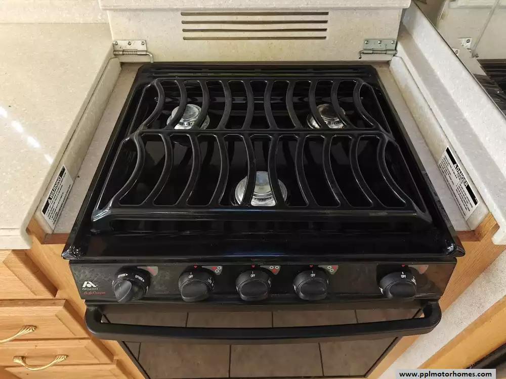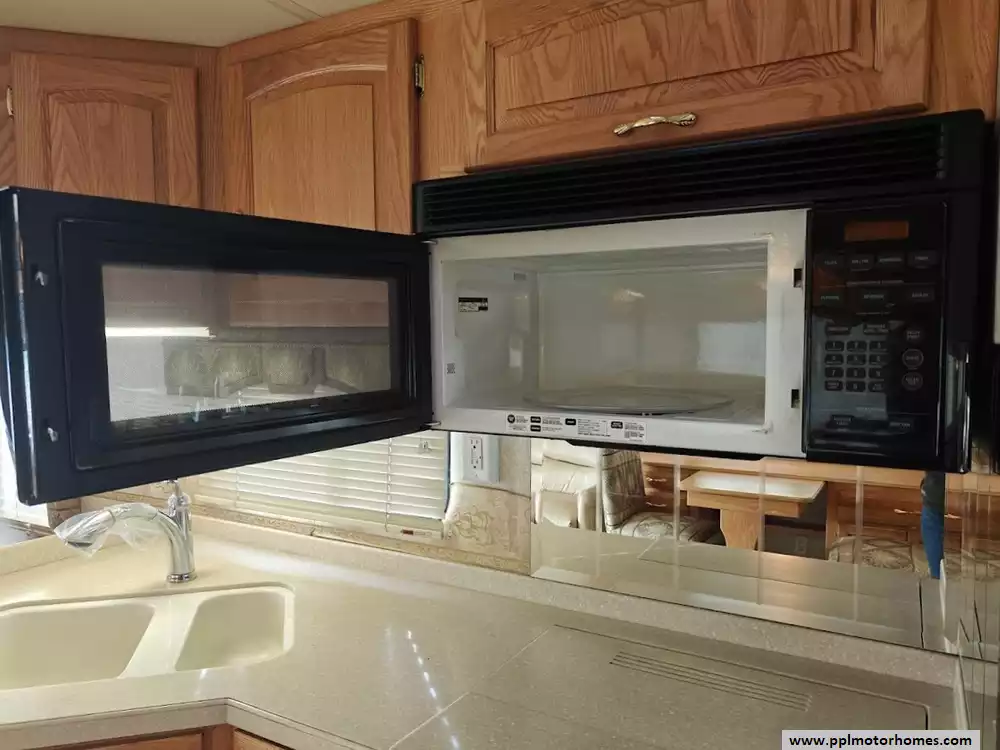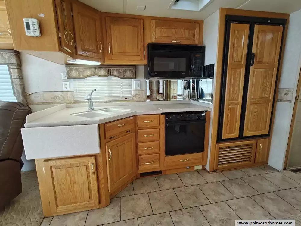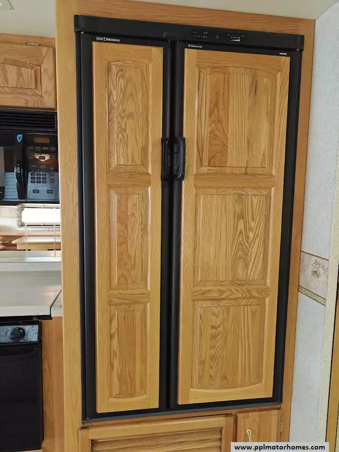 The passenger side features a complete kitchen with solid-surface countertops, a double-door Dometic refrigerator, a convection microwave, and a three-burner range.