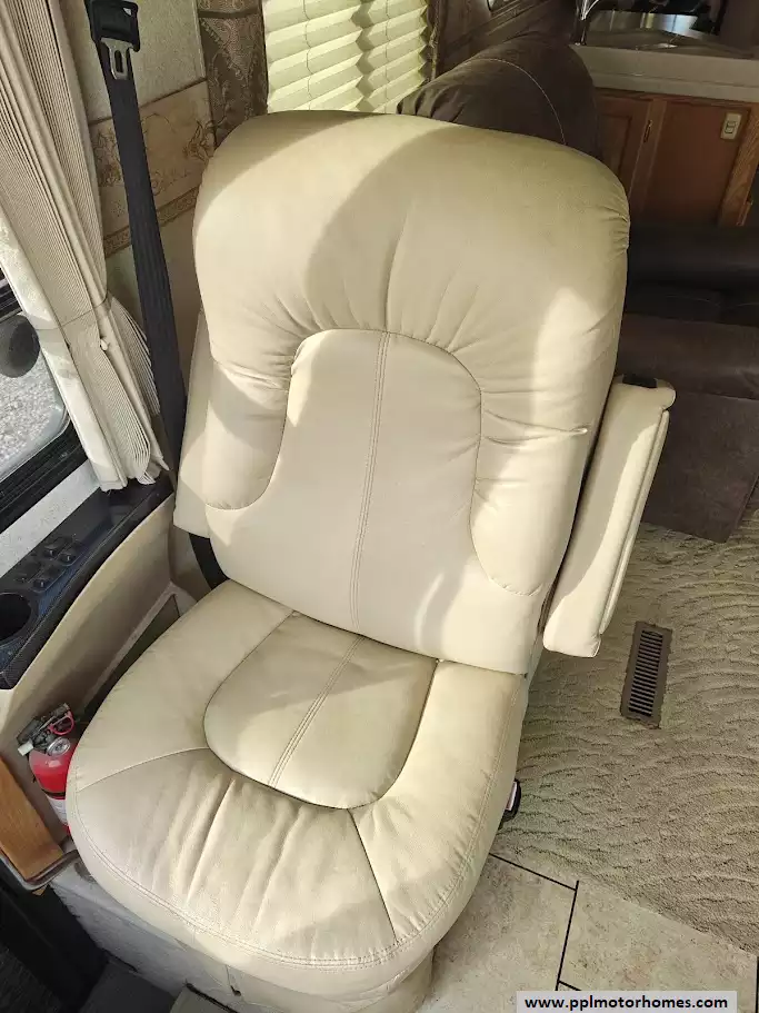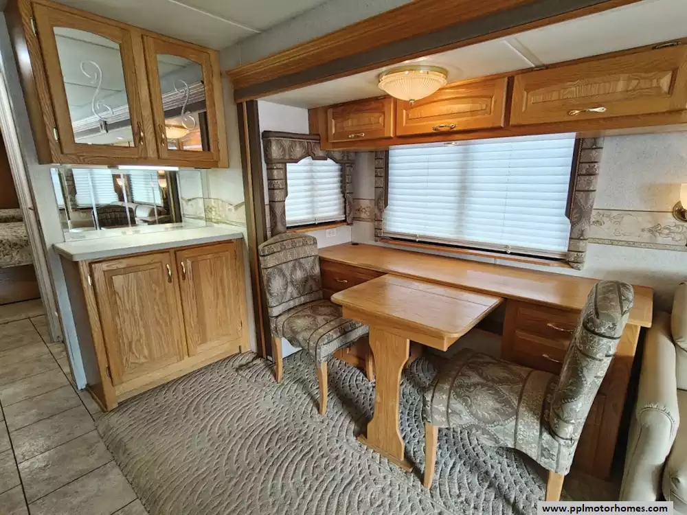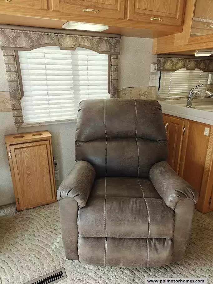 The cockpit area includes captain's chairs that swivel to become part of the living space. A large slide-out on the driver's side houses a dinette table with four chairs and a sofa or recliner