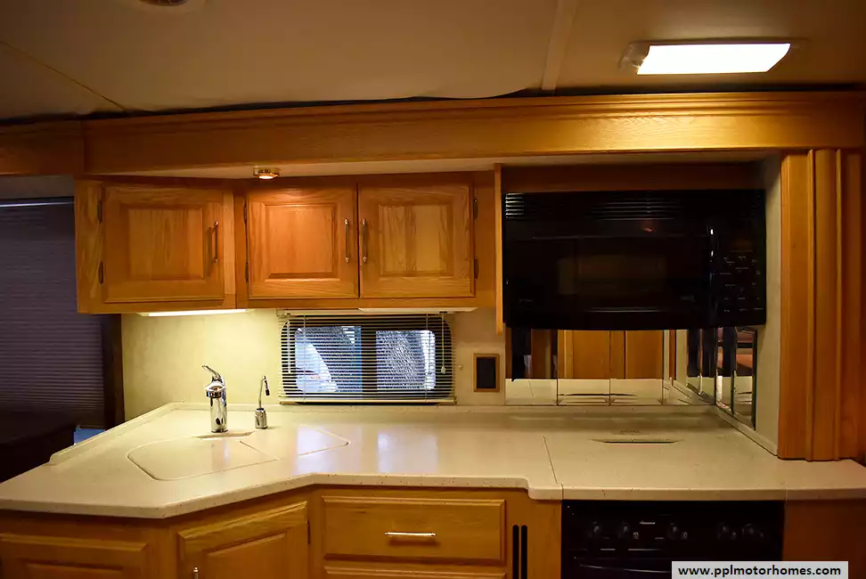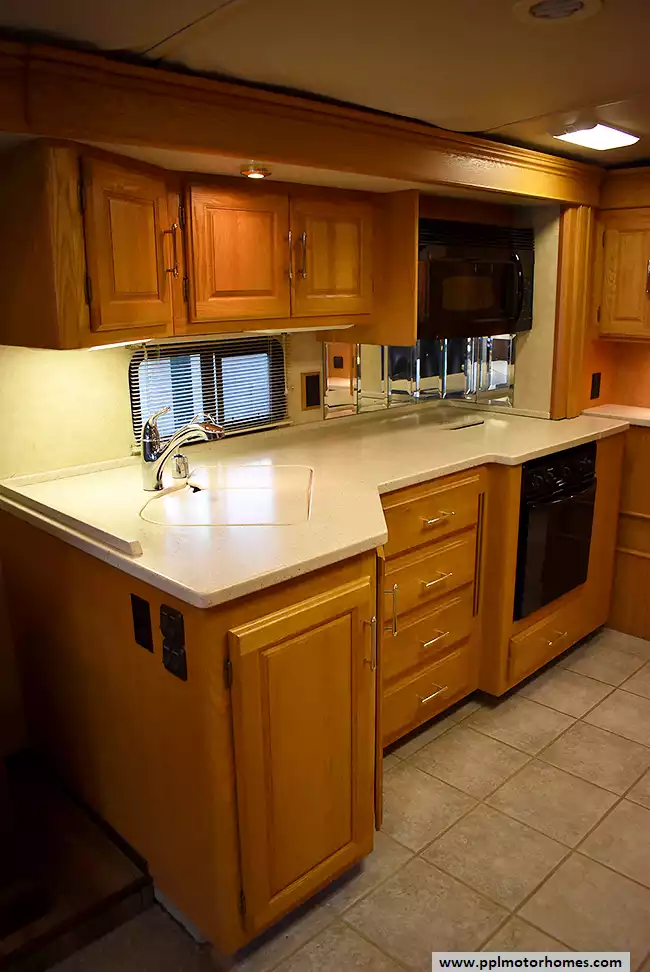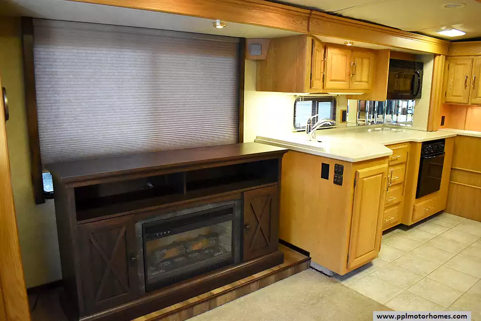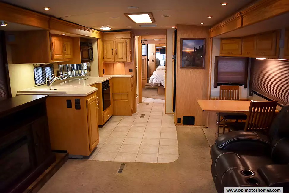 The spacious 40KD floorplan offers a large living area with opposing seating, a fully equipped kitchen with generous counter space and storage, and a private rear bedroom. The mid-coach bathroom provides convenience and separation between living and sleeping areas.