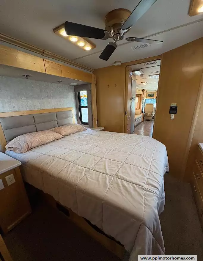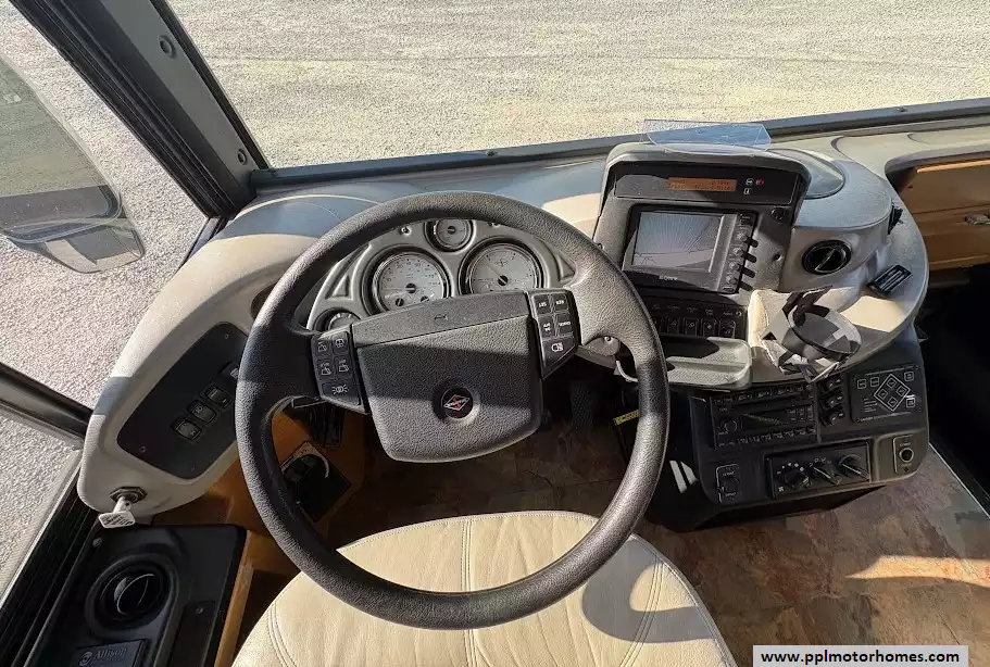 This 2006 Revolution Le 40E has a custom design, sleeps up to 6, has a 400hp Cat C9 Caterpillar Engine, Exhaust Brake, 3 Slide-outs, Onan Diesel Generator, 2 Ducted Air Conditioners, Levelers, 4 Door 12v Norcold Refrigerator, Automatic Main Awning, Backup Camera, GPS System, Solar Panel, 2 TVs, Convection Microwave, 3 Burner Range, Oven