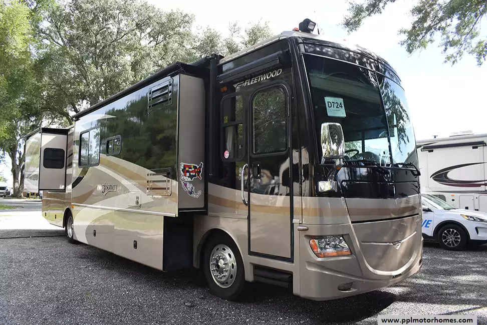This 2007 Discovery by Fleetwood 40X has a 330hp Caterpillar Engine On a Freightliner Chassis, Air Ride Suspension, Exhaust Brake, 3 Slide-outs, Onan Diesel Generator, 2 Ducted Air Conditioners, Levelers, Residential Samsung Refrigerator, In-Fridge Ice Maker, Automatic Main Awning, Washer/Dryer, Backup Camera, Outside Entertainment System, 2 TVs, Outside Shower, Central Vacuum, Convection Microwave, 2 Burner Range