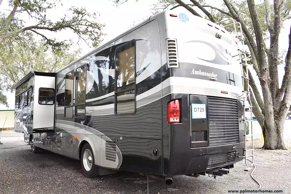 This beautiful quad-slide Ambassador is loaded with comfort and ready for the road. Built on the Roadmaster chassis with a Cummins diesel engine, exhaust brake, and smooth Cushion Air Glide suspension. Features a spacious front-kitchen layout, large living area, full bath, and rear bedroom. Equipped with a diesel generator, dual-mode 10-gal water heater, and huge storage. Well-cared for and offers the perfect blend of power, space, and reliability for your next adventure.
