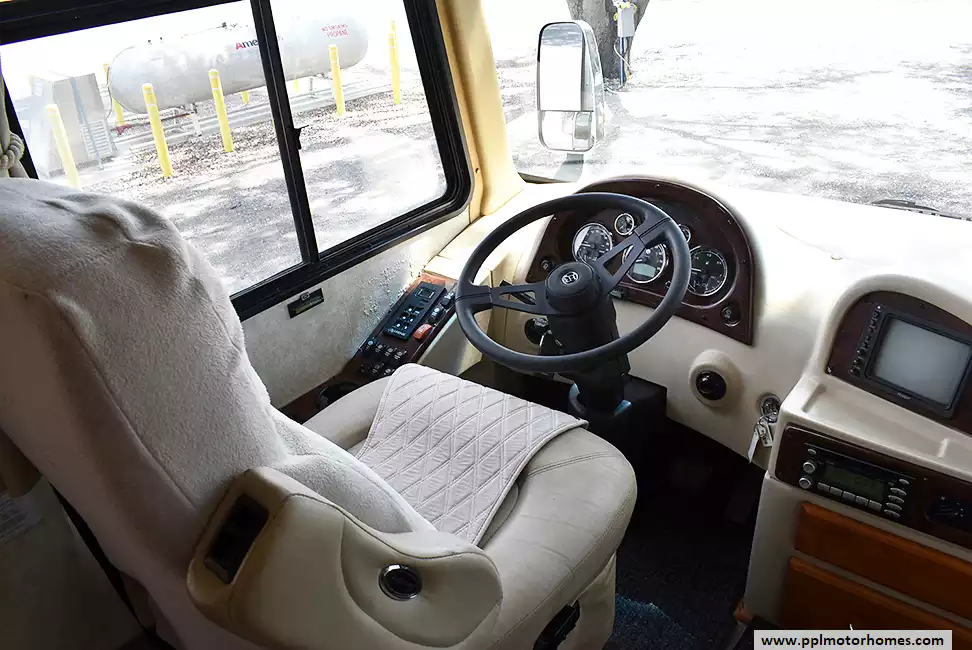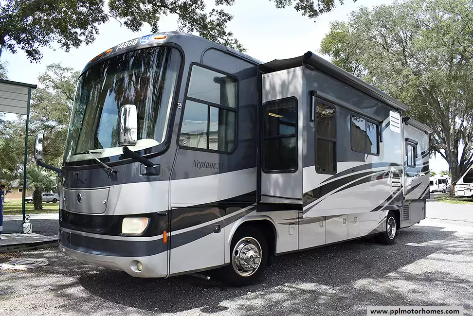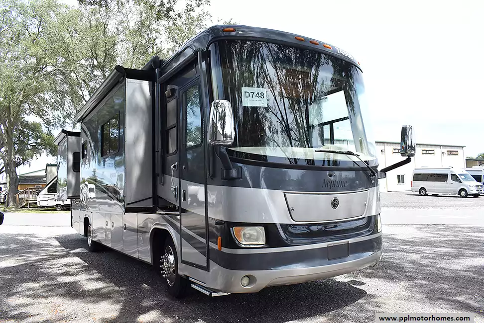 This 2007 Neptune Series 36PDQ has a 325hp Cummins Engine On a Freightliner Chassis, Air Ride Suspension, Exhaust Brake, 4 Slide-outs, Onan Diesel Generator, 2 Ducted Air Conditioners, Levelers, Frigidaire Refrigerator, Automatic Main Awning And Window/Slide/Door Awnings, Washer/Dryer Connections, Backup Camera, 2 TVs, DVD Player, Outside Shower, Central Vacuum, Convection Microwave, 3 Burner Range