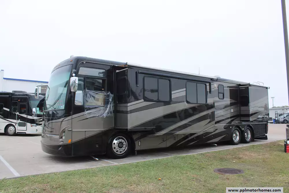 Specs: Length: 42.8 ft., Height: 12.7 ft., Width: 8.45 ft., Interior Width: 7.95 ft., Interior Height: 7 ft., Total Fresh Water Tank Capacity: 105 gal., Total Gray Water Tank Capacity: 65 gal., Total Black Water Tank Capacity: 45 gal., Total Propane Tank Capacity: 32 gal.