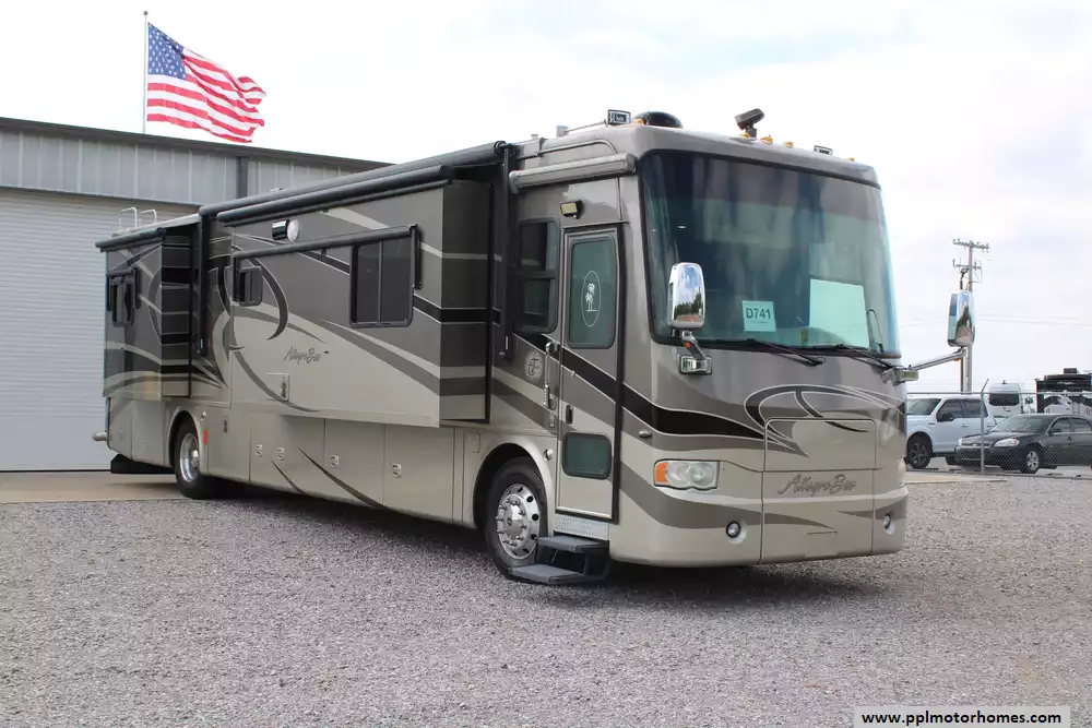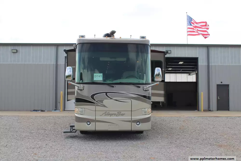 This 2007 Allegro Bus by Tiffin 40QSP has a 400hp Cummins Engine On a Freightliner Chassis, 4 Slide-outs, Onan Diesel Generator, 2 Ducted Air Conditioners, Levelers, 4 Door Side by Side Norcold Refrigerator, In-Fridge Ice Maker, Automatic Main Awning And Window/Slide/Door Awnings, Washer/Dryer, Backup Camera, Outside Entertainment System, 3 TVs, Outside Shower, Convection Microwave, 2 Burner Range