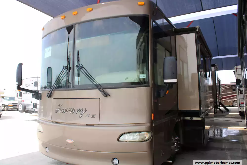 This 2007 Winnebago Journey ASSUME 34SH has a 300Hp Cummins Engine On a Freightliner Chassis, Air Bag Suspension, Exhaust Brake, 2 Slide-outs, Onan Diesel Generator, 2 Non-Ducted Air Conditioners, Levelers, 4 Door Gas/110V Norcold Refrigerator, Automatic Main Awning And Window/Slide/Door Awnings, Washer/Dryer Connections, Backup Camera, Satellite Dish, 2 TVs, Outside Shower, Convection Microwave, 3 Burner Range