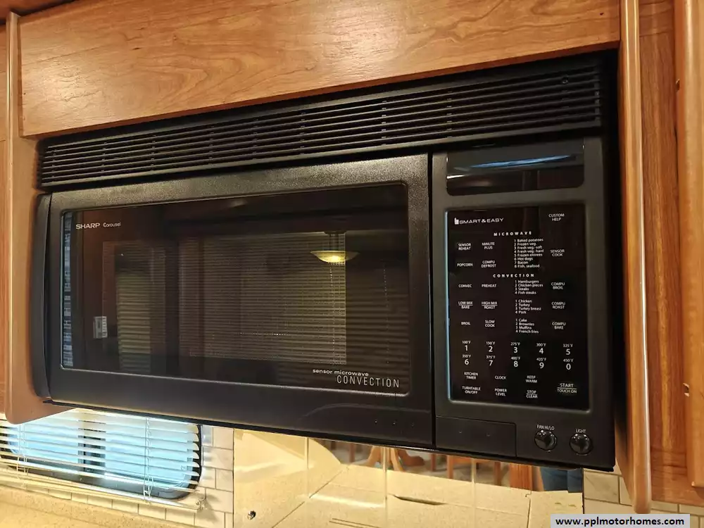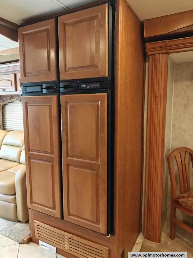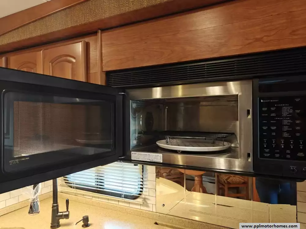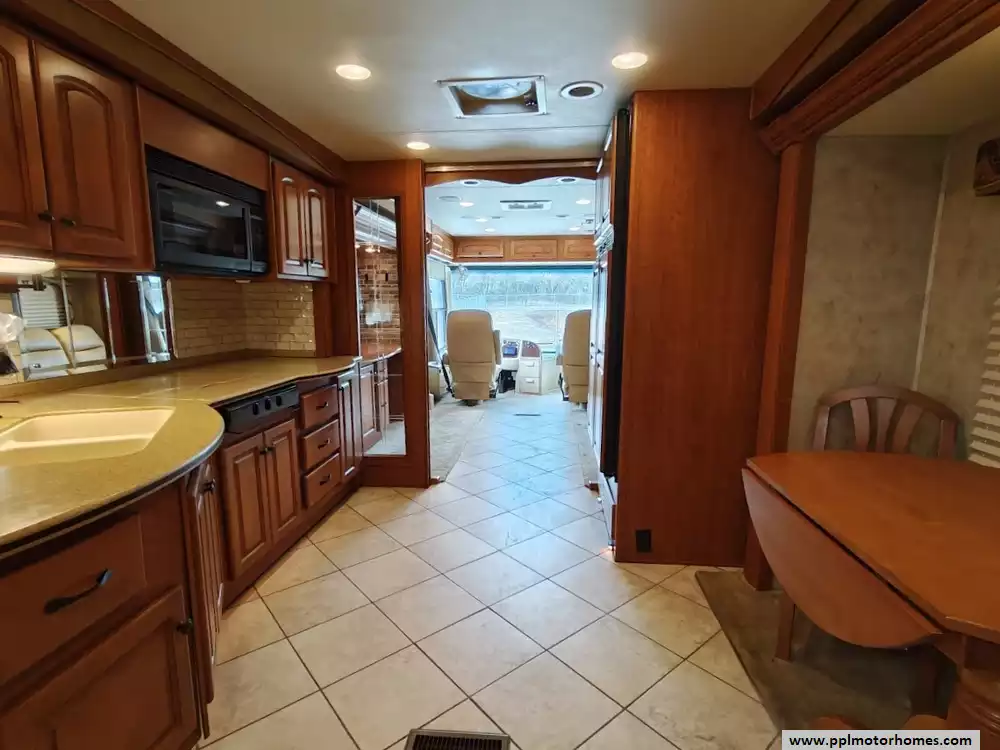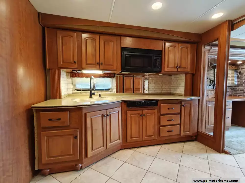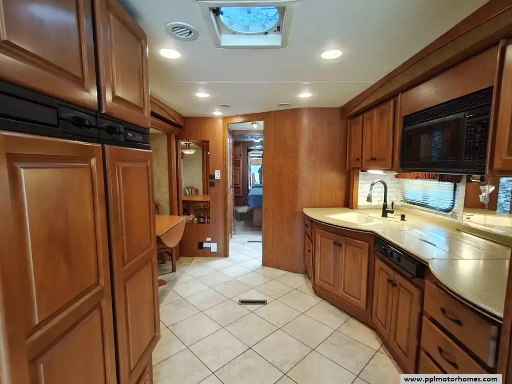 The galley is mid-coach and includes the double kitchen sink, a 3-burner range with a microwave/convection oven above, a pull-out counter/cabinet extension, and a four-door refrigerator with an icemaker.