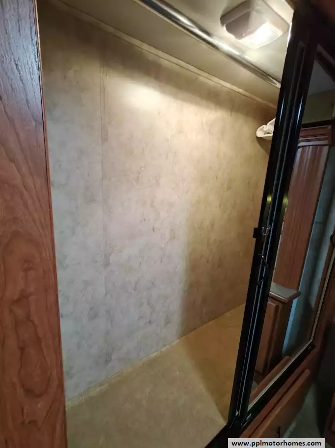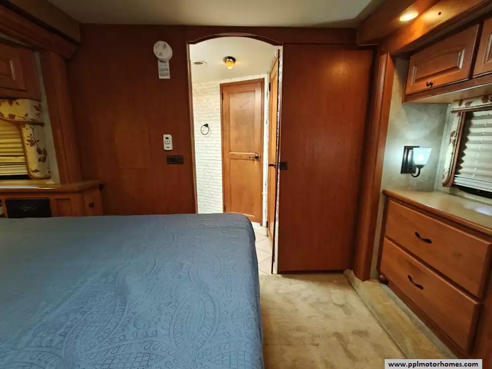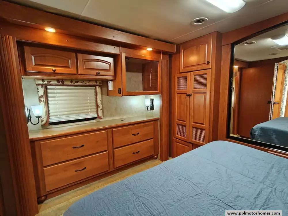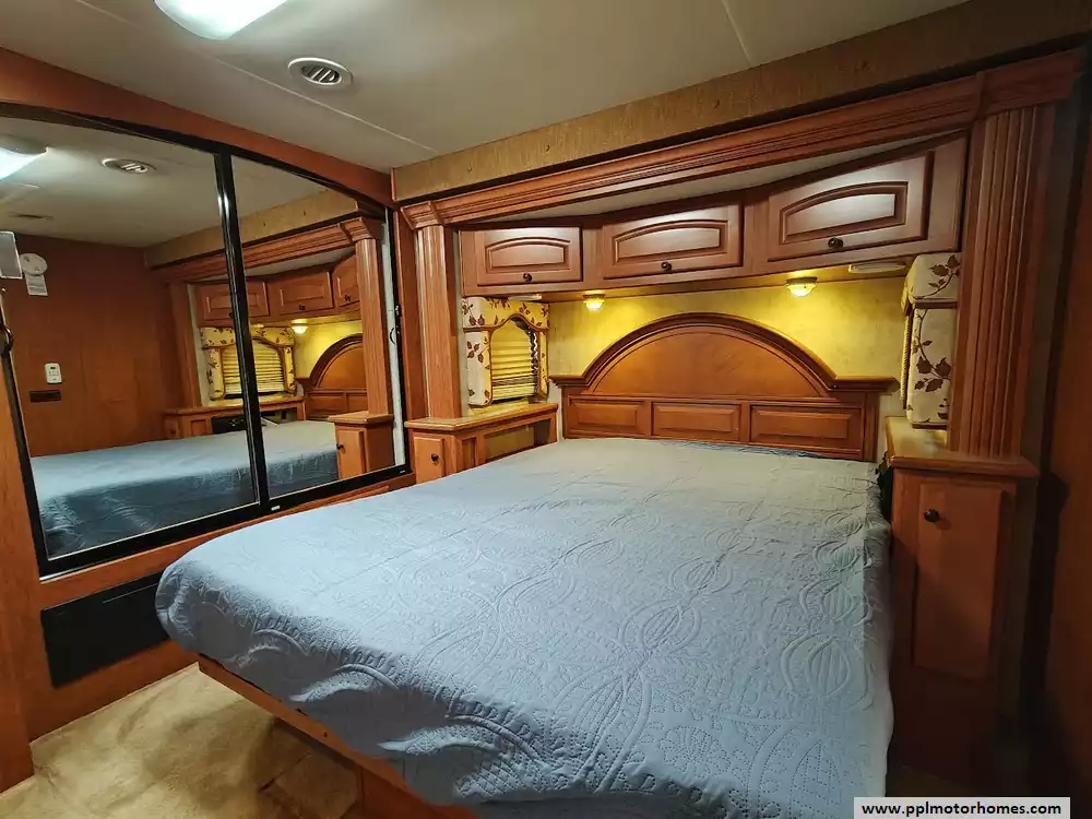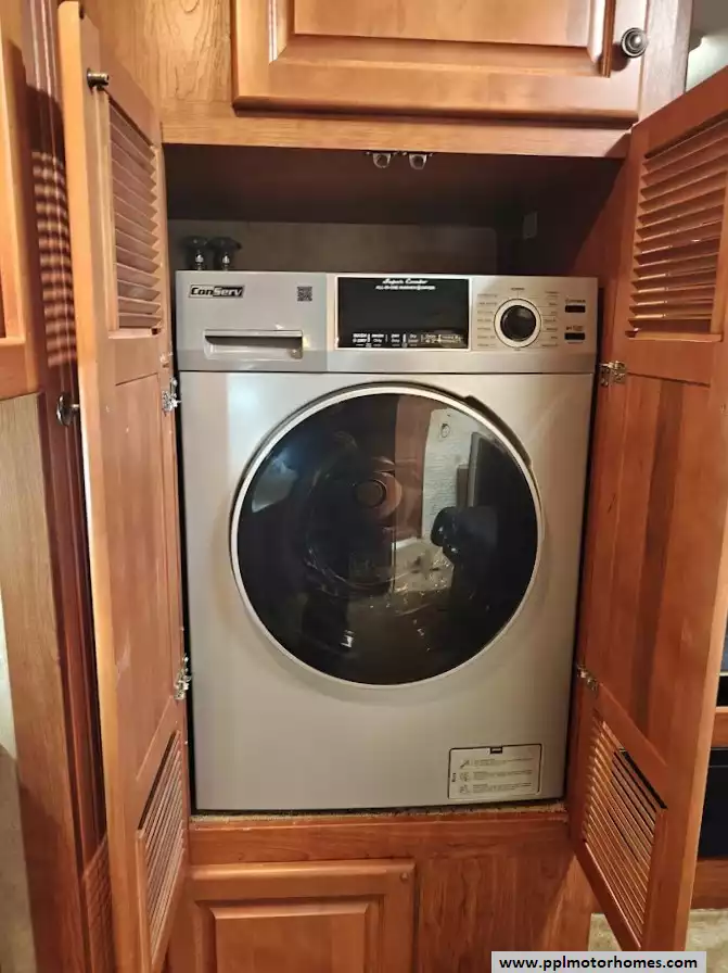 The master suite contains a queen-size bed, two wardrobes with significant storage space, overhead cabinet for a RV and a sec, and a combo washer dryer unit.