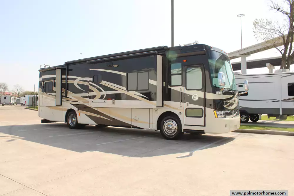 Specs: Length: 36.75 ft., Width: 8.42 ft., Height: 12.58 ft.,Interior Height: 7 ft., Fuel Capacity: 100 gal., Total Fresh Water Tank Capacity: 90 gal., Total Gray Water Tank Capacity: 70 gal., Total Black Water Tank Capacity: 45 gal., Total Number of Propane Tanks 1., Propane Tank Capacity: 151 gal.