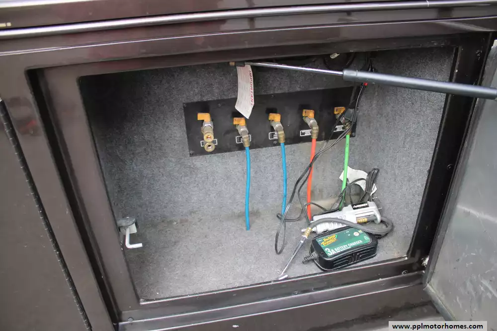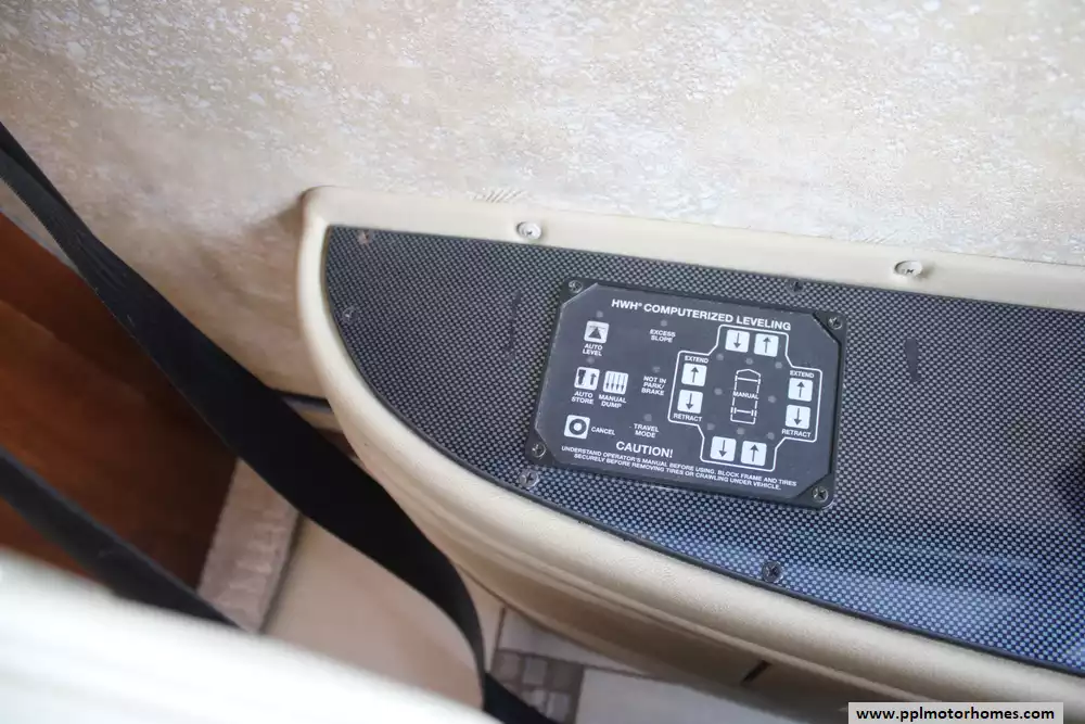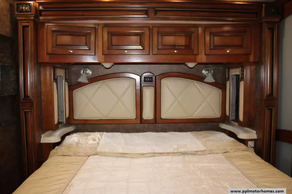 Luxury touches often include ultra-leather seating, multiple LCD TVs, central vacuum system, stacked washer/dryer, Aqua-Hot hydronic heating, automatic hydraulic leveling jacks, rear and side cameras, tinted fual-pane windows, power awnings, and modern conveniences, making it comfortable for long-distance travel or full-time RV living.