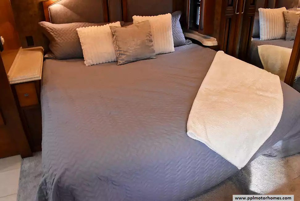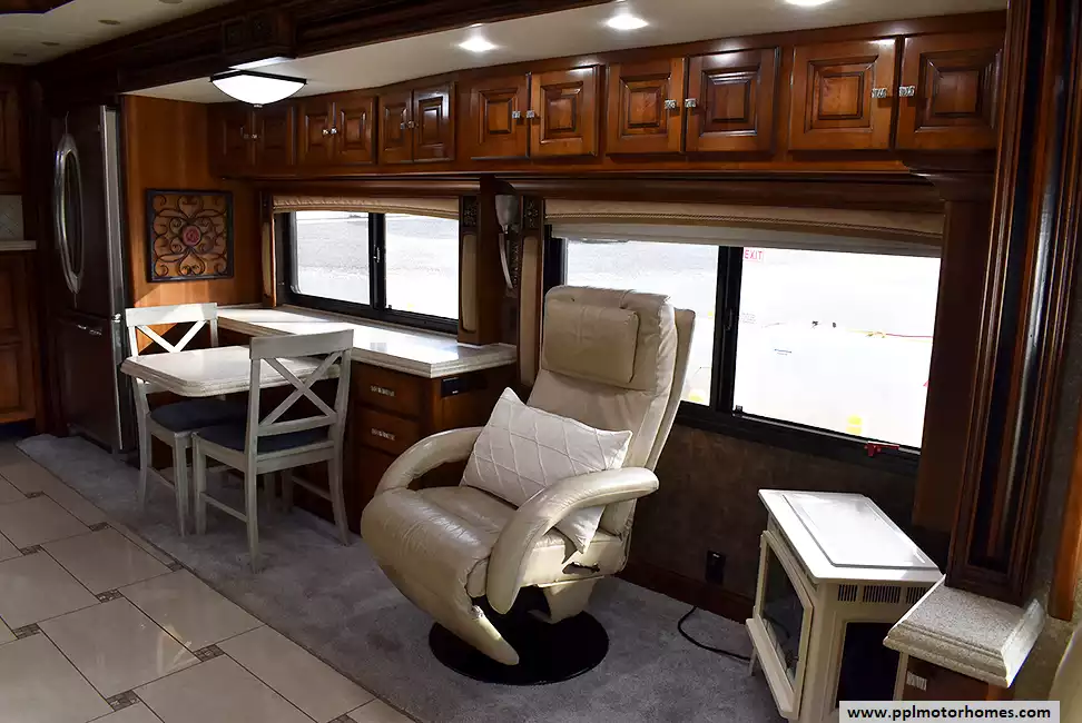 This Allegro Bus 40QXP is fully equipped and recently updated for peace of mind on the road. It features side and rear view cameras, a pull-out couch, recliner chair, and even a portable fireplace for added comfort. The bedroom includes a closet safe, while the coach offers the convenience of the Aqua-Hot heating system
