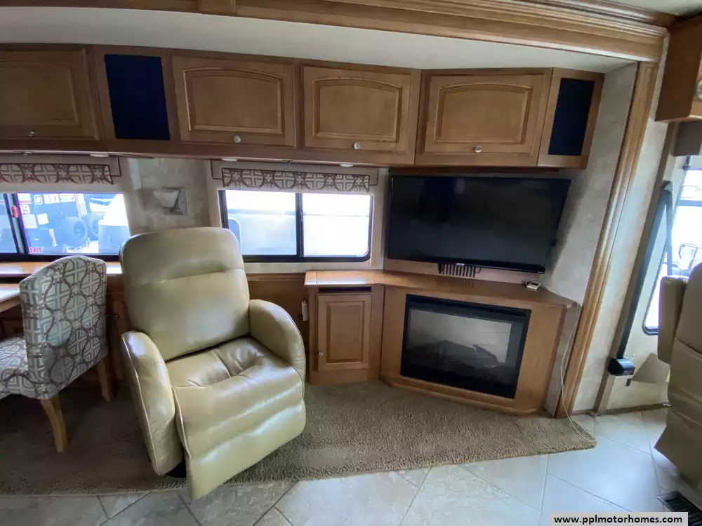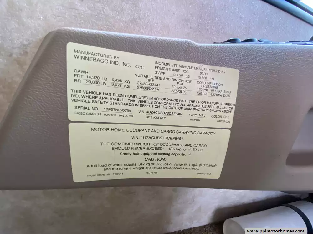 This 2012 Winnebago Journey 40U has a 380hp 8.3l ISL Cummins Engine On a Freightliner Chassis, Air Bag Suspension, Exhaust Brake, 4 Slide-outs, Onan Diesel Generator, 3 Ducted Air Conditioners, Levelers, Single Door Residential Hisense Refrigerator, In-Fridge Ice Maker, Automatic Main Awning And Slide/Door Awnings, Washer/Dryer, Backup Camera, GPS System, Solar Panel, Satellite Dish, Outside Entertainment System, 2 TVs, 2 DVD Players, Satellite Radio, Outside Shower, Fireplace, Convection Microwave, 4 Burner Range
