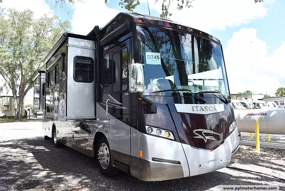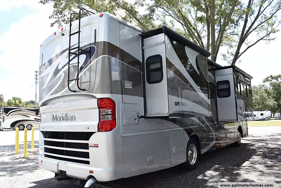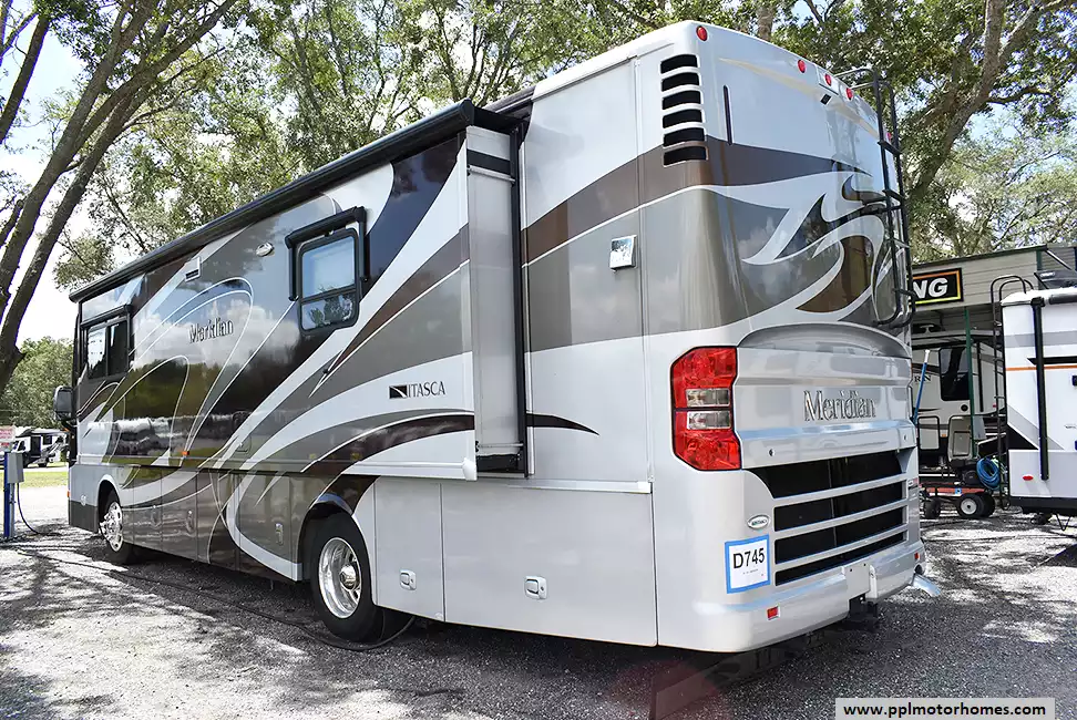 This 2013 Itasca Meridian 34B has a 340hp Cummins Engine On a Freightliner Chassis, Air Bag Suspension, Exhaust Brake, 3 Slide-outs, Onan Diesel Generator, 2 Ducted Air Conditioners, Levelers, Residential Refrigerator, Stand-Alone Ice Maker, Automatic Main Awning And Window/Slide/Door Awnings, Washer/Dryer, Sectional Sofa/Bed, Backup Camera, Satellite Receiver, 2 TVs, DVD Player, Outside Shower, Convection Microwave, 3 Burner Range
