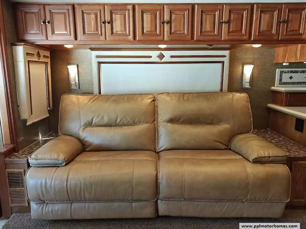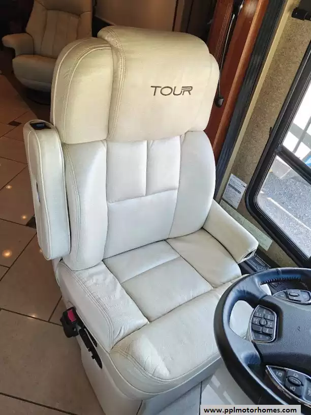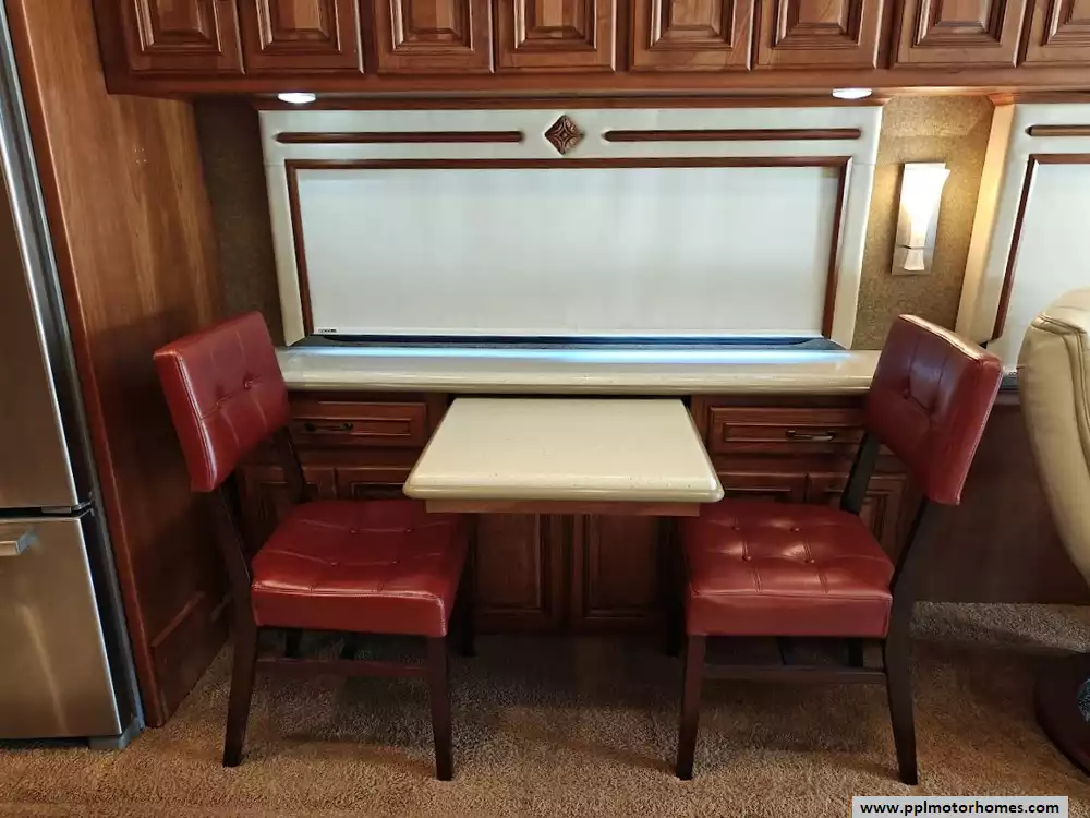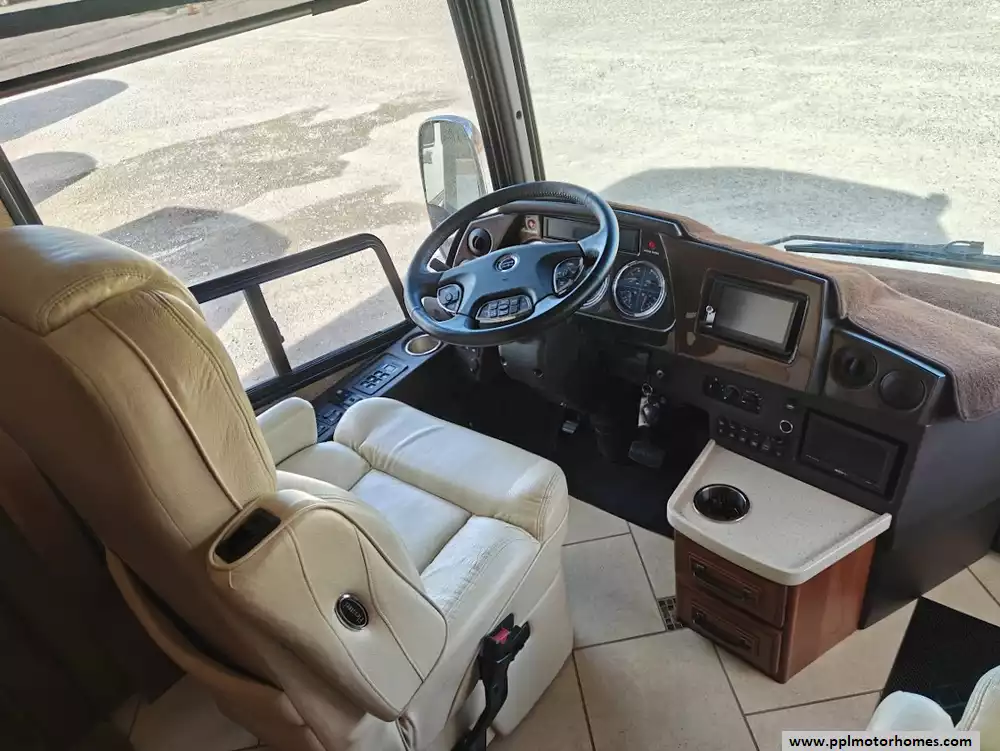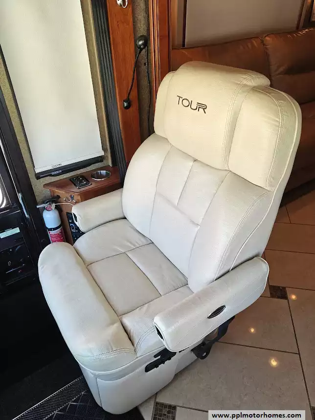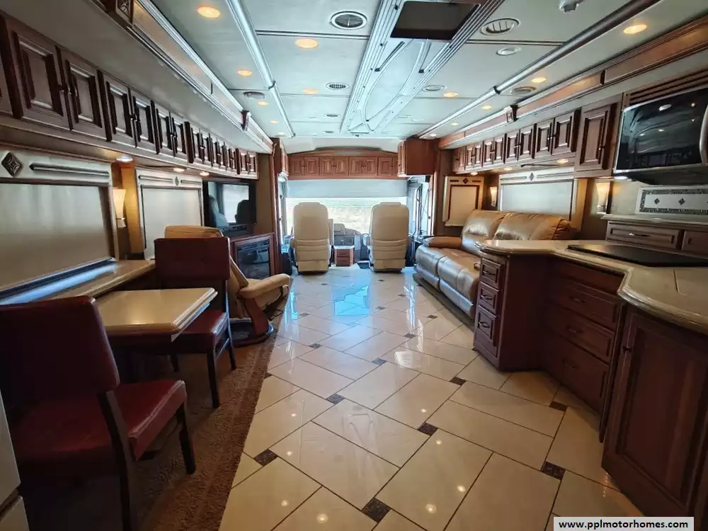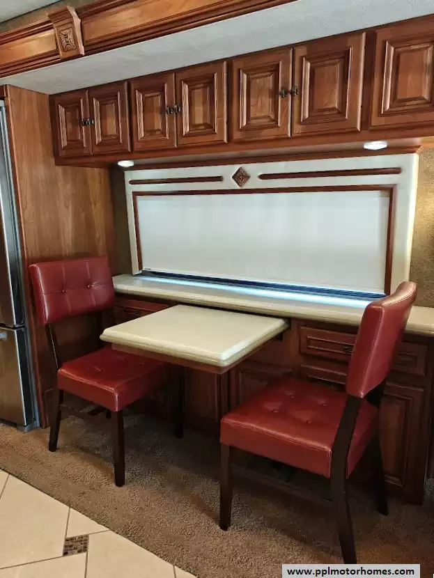 The 2013 Winnebago Tour 42QD is a luxury Class A diesel pusher motorhome known for its spacious and feature-rich design, built on the robust Freightliner Maxum Chassis with a powerful 450-hp Cummins 8.9L turbo-diesel engine. A key feature of the 42QD floor plan is the inclusion of a bath-and-a-half configuration, featuring a private master bath and a guest half-bath mid-coach. The master bedroom is a luxurious and well-appointed space, designed for comfort and extensive storage, and it is located at the rear of the coach. The floor plan features a king size bed, provides significant storage, including a large wardrobe across the back of the coach, as well as additional wardrobe/pantry space as part of one of the slide-outs. The master bedroom leads directly into the full rear bathroom, which features a spacious glass-door shower with a seat. There is also a mid-coach half bath conveniently located in the living area, separate from the full master bathroom at the rear. The living area is designed for luxury and comfort, serving as the central lounge and entertainment hub of the coach. It is a spacious environment enhanced by the three slide-outs and a 7-foot interior height. A key feature is the extendable sectional sofa, which can be configured for lounging or as additional sleeping space. The kitchen is a high-end, residential-style space designed for full-time living and serious cooking. It features premium appliances, abundant storage, and solid finishes. The kitchen features elegant solid surface countertops, a large, dual-basin stainless steel sink, Whirlpool refridgerator,3 burner stove and microwave. The dining area adjacent to the kitchen features a dining table with chairs, providing flexible seating for meals or entertaining guests.