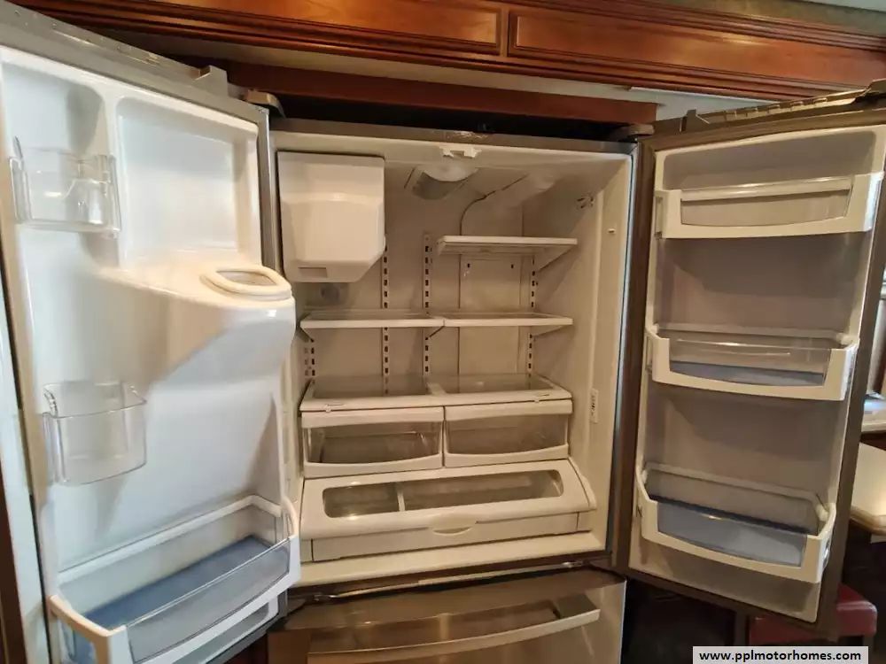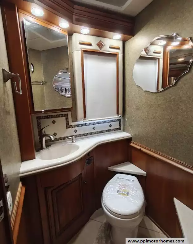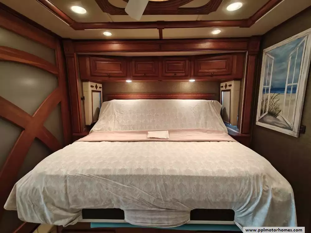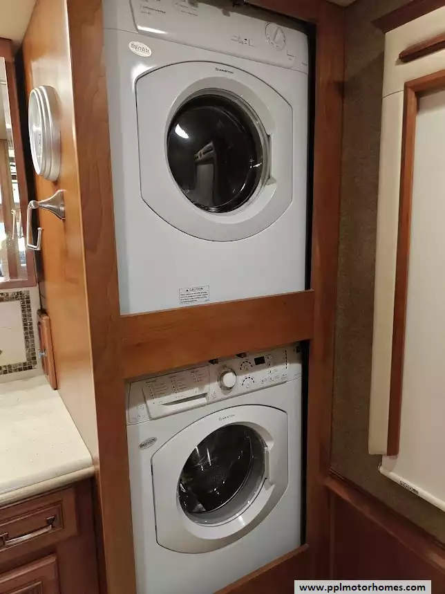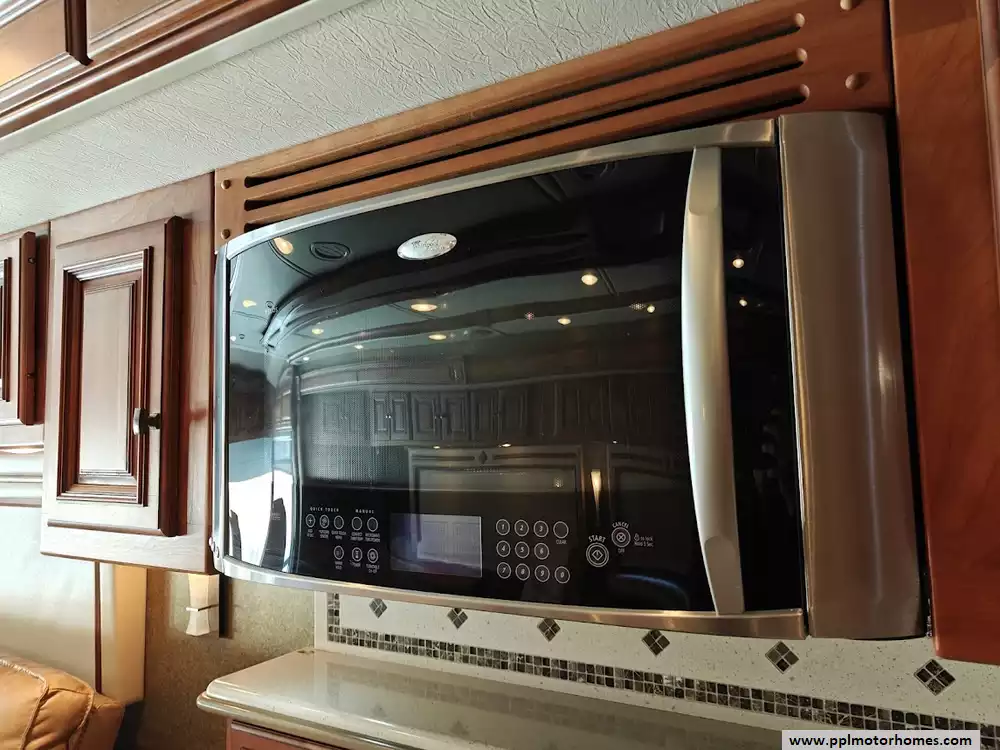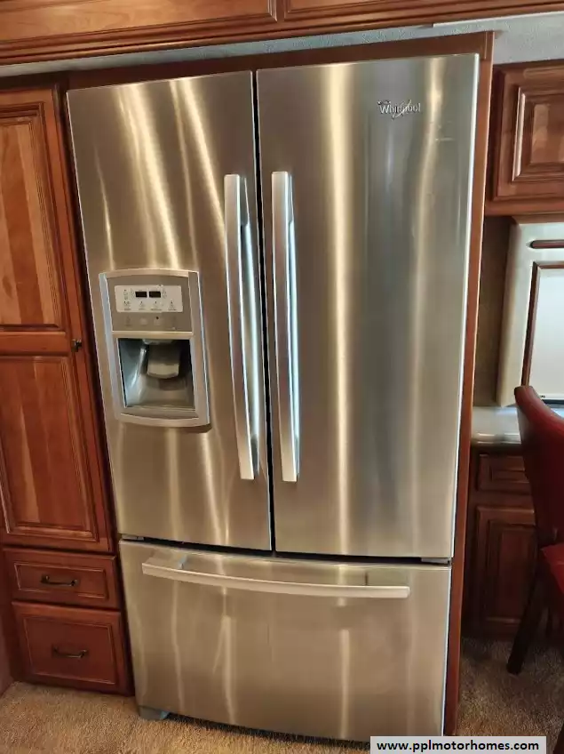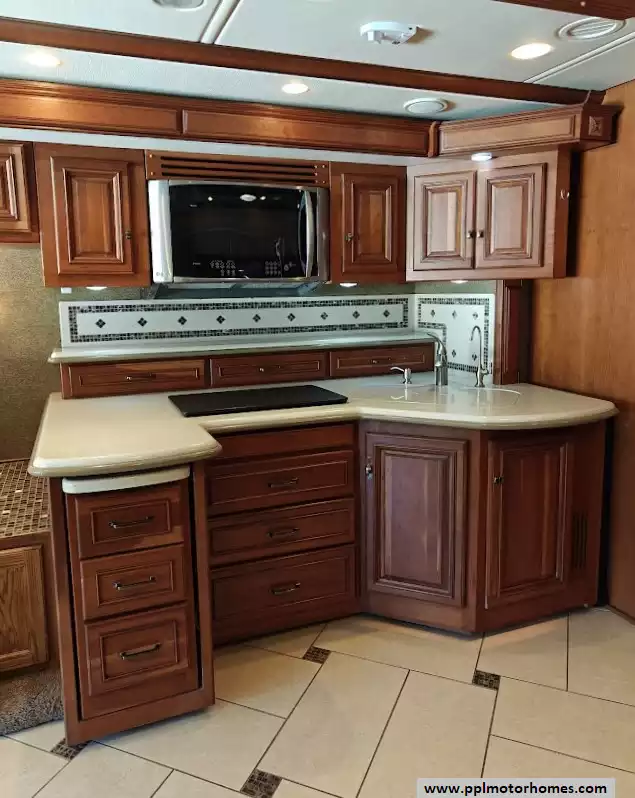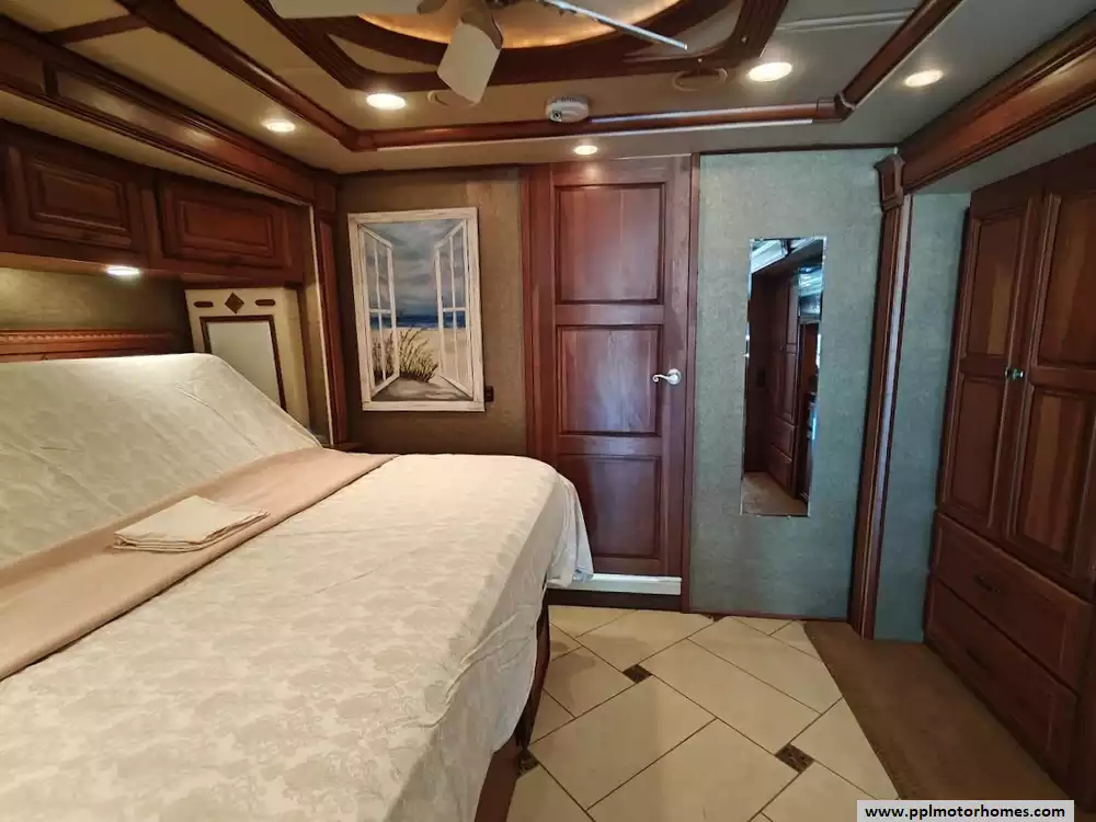 The 2013 Winnebago Tour 42QD is a luxury Class A diesel pusher motorhome known for its spacious and feature-rich design, built on the robust Freightliner Maxum Chassis with a powerful 450-hp Cummins 8.9L turbo-diesel engine. A key feature of the 42QD floor plan is the inclusion of a bath-and-a-half configuration, featuring a private master bath and a guest half-bath mid-coach. The master bedroom is a luxurious and well-appointed space, designed for comfort and extensive storage, and it is located at the rear of the coach. The floor plan features a king size bed, provides significant storage, including a large wardrobe across the back of the coach, as well as additional wardrobe/pantry space as part of one of the slide-outs. The master bedroom leads directly into the full rear bathroom, which features a spacious glass-door shower with a seat. There is also a mid-coach half bath conveniently located in the living area, separate from the full master bathroom at the rear. The living area is designed for luxury and comfort, serving as the central lounge and entertainment hub of the coach. It is a spacious environment enhanced by the three slide-outs and a 7-foot interior height. A key feature is the extendable sectional sofa, which can be configured for lounging or as additional sleeping space. The kitchen is a high-end, residential-style space designed for full-time living and serious cooking. It features premium appliances, abundant storage, and solid finishes. The kitchen features elegant solid surface countertops, a large, dual-basin stainless steel sink, Whirlpool refridgerator,3 burner stove and microwave. The dining area adjacent to the kitchen features a dining table with chairs, providing flexible seating for meals or entertaining guests.