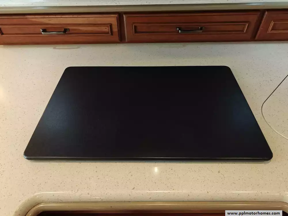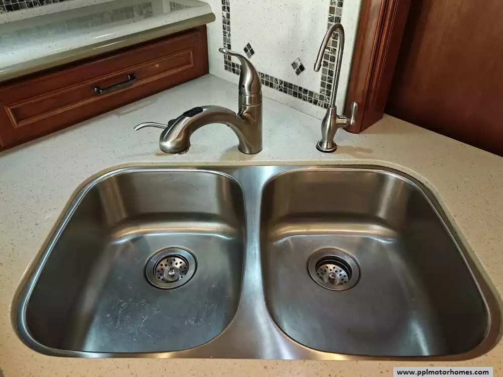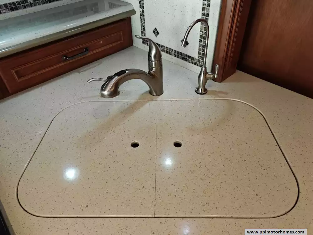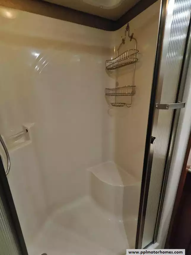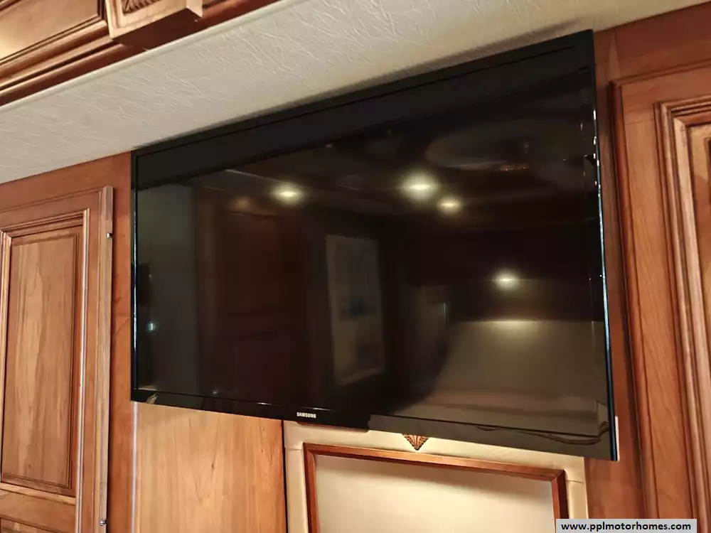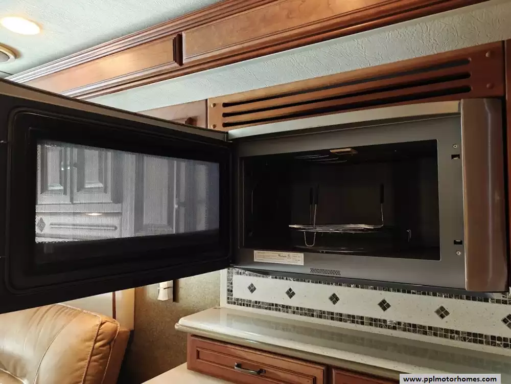 The 2013 Winnebago Tour 42QD is a luxury Class A diesel pusher motorhome known for its spacious and feature-rich design, built on the robust Freightliner Maxum Chassis with a powerful 450-hp Cummins 8.9L turbo-diesel engine. A key feature of the 42QD floor plan is the inclusion of a bath-and-a-half configuration, featuring a private master bath and a guest half-bath mid-coach. The master bedroom is a luxurious and well-appointed space, designed for comfort and extensive storage, and it is located at the rear of the coach. The floor plan features a king size bed, provides significant storage, including a large wardrobe across the back of the coach, as well as additional wardrobe/pantry space as part of one of the slide-outs. The master bedroom leads directly into the full rear bathroom, which features a spacious glass-door shower with a seat. There is also a mid-coach half bath conveniently located in the living area, separate from the full master bathroom at the rear. The living area is designed for luxury and comfort, serving as the central lounge and entertainment hub of the coach. It is a spacious environment enhanced by the three slide-outs and a 7-foot interior height. A key feature is the extendable sectional sofa, which can be configured for lounging or as additional sleeping space. The kitchen is a high-end, residential-style space designed for full-time living and serious cooking. It features premium appliances, abundant storage, and solid finishes. The kitchen features elegant solid surface countertops, a large, dual-basin stainless steel sink, Whirlpool refridgerator,3 burner stove and microwave. The dining area adjacent to the kitchen features a dining table with chairs, providing flexible seating for meals or entertaining guests.
