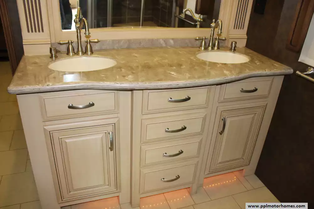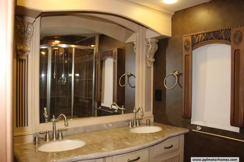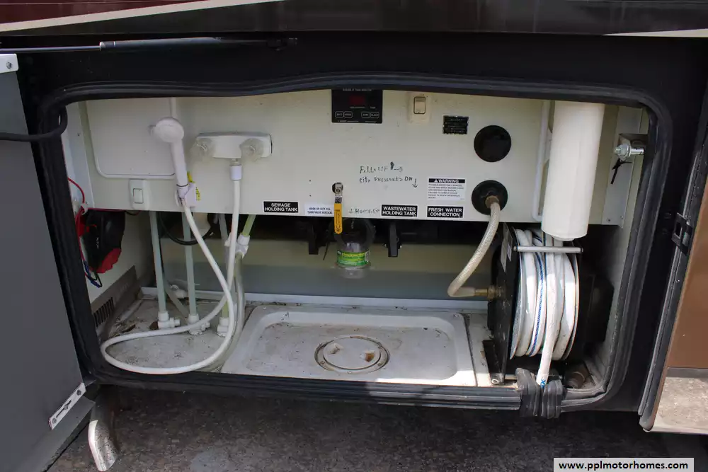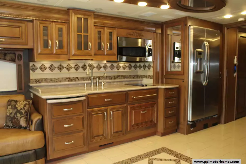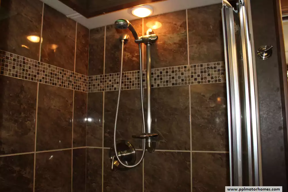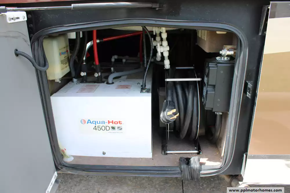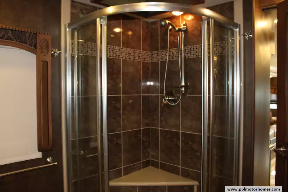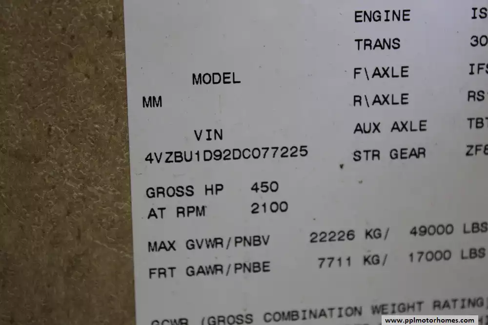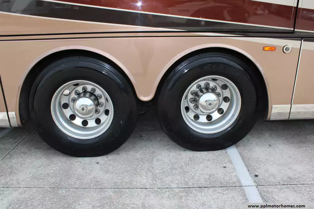 Specs: Length: 44.92 ft., Width: 8.42 ft., Height: 12.92 ft., Interior Height: 7 ft., Fuel Capacity: 150 gal., Total Fresh Water Tank Capacity: 95 gal., Total Gray Water Tank Capacity: 52 gal., Total Black Water Tank Capacity: 52 gal., Number of Propane Tanks: 1, Total Propane Tank Capacity: 212 lbs.