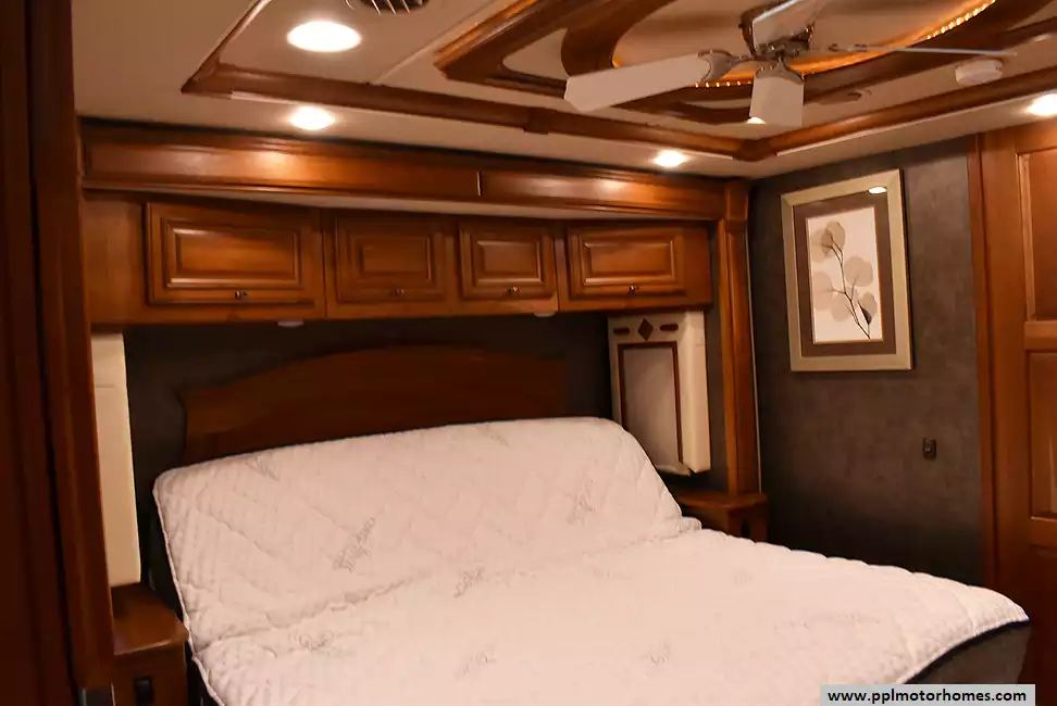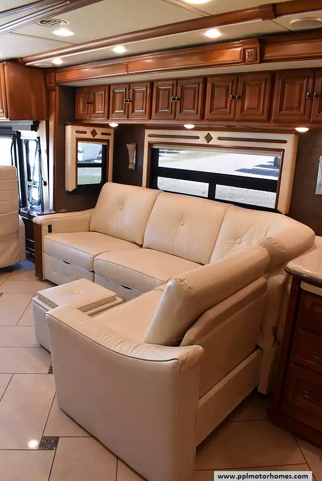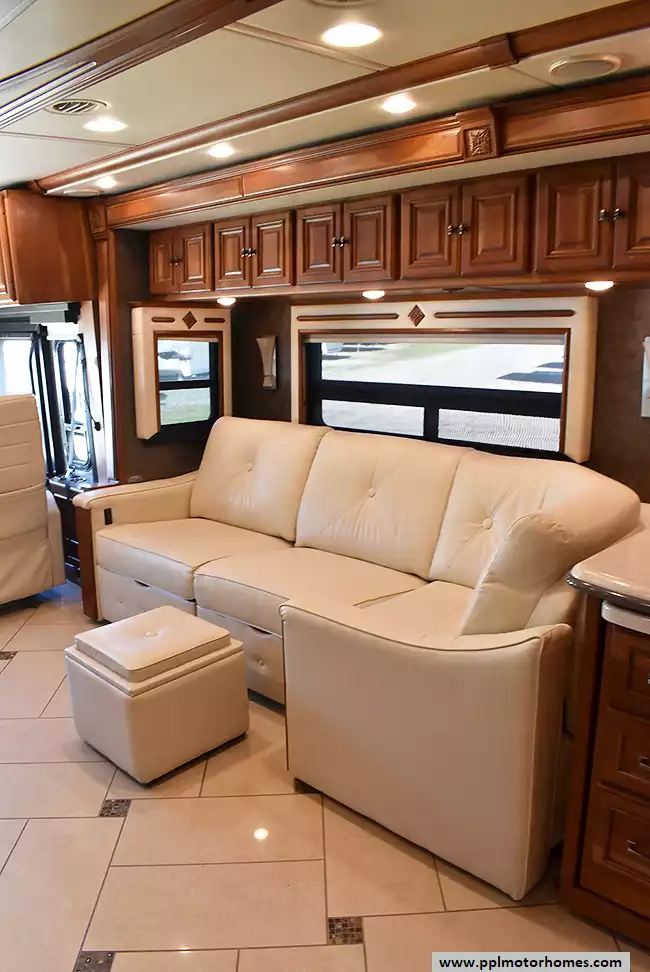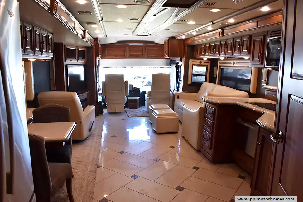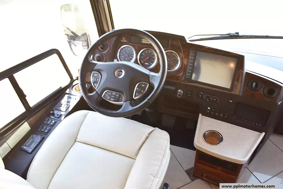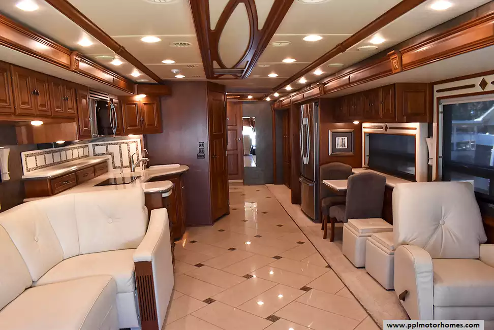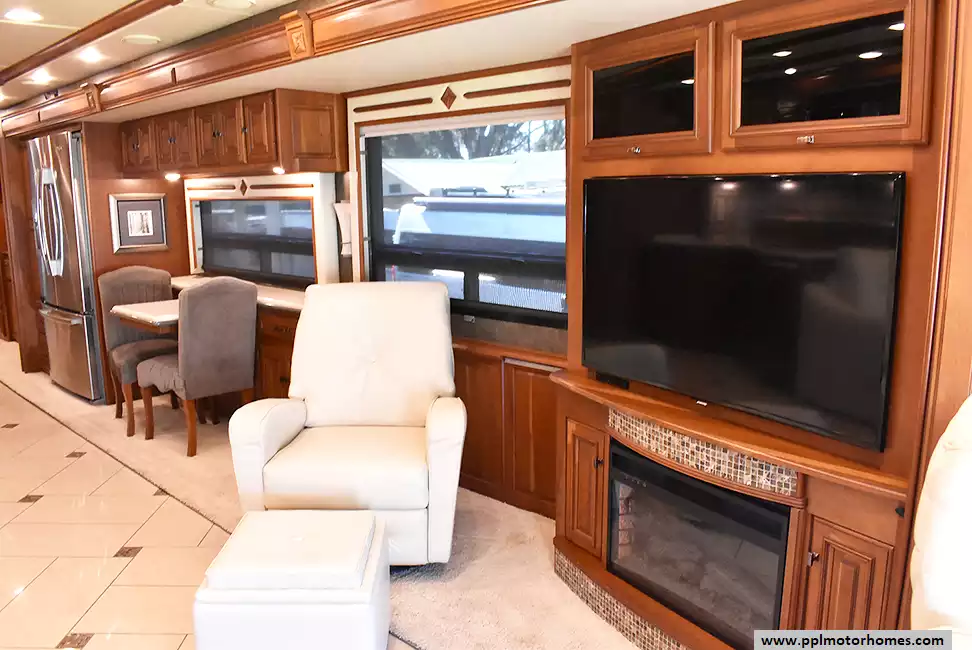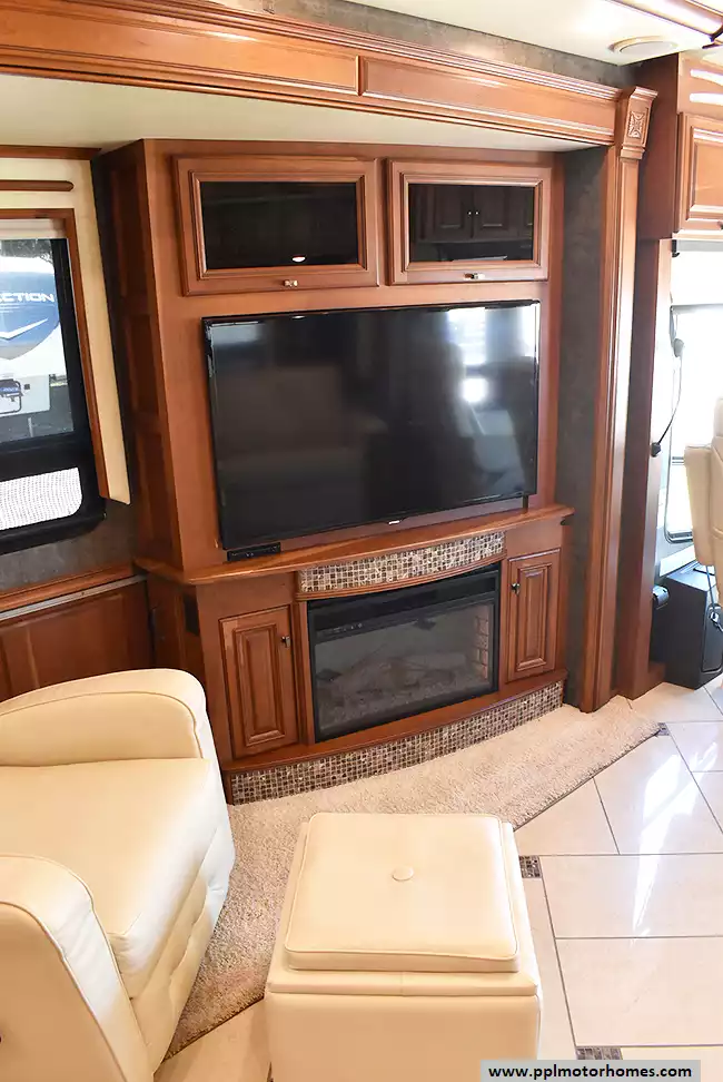 Enjoy the comfort of triple slide-outs, including a full-wall slide for maximum living space. Additional highlights include a 10kW Onan diesel generator, automatic leveling, and an exterior entertainment center.