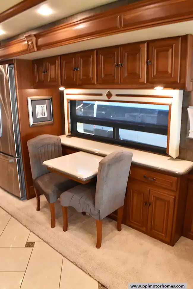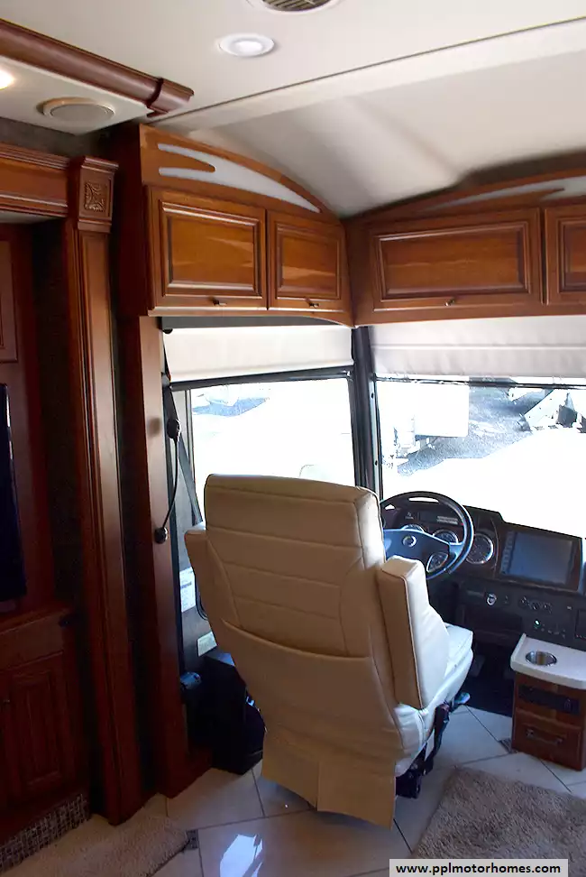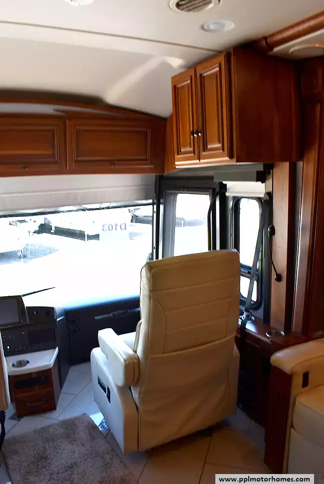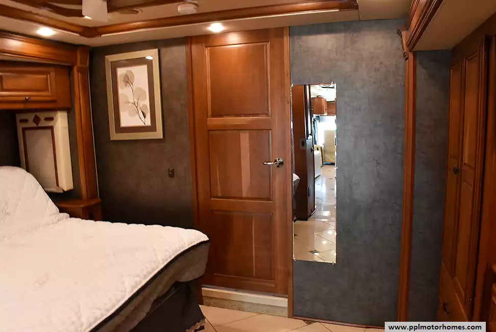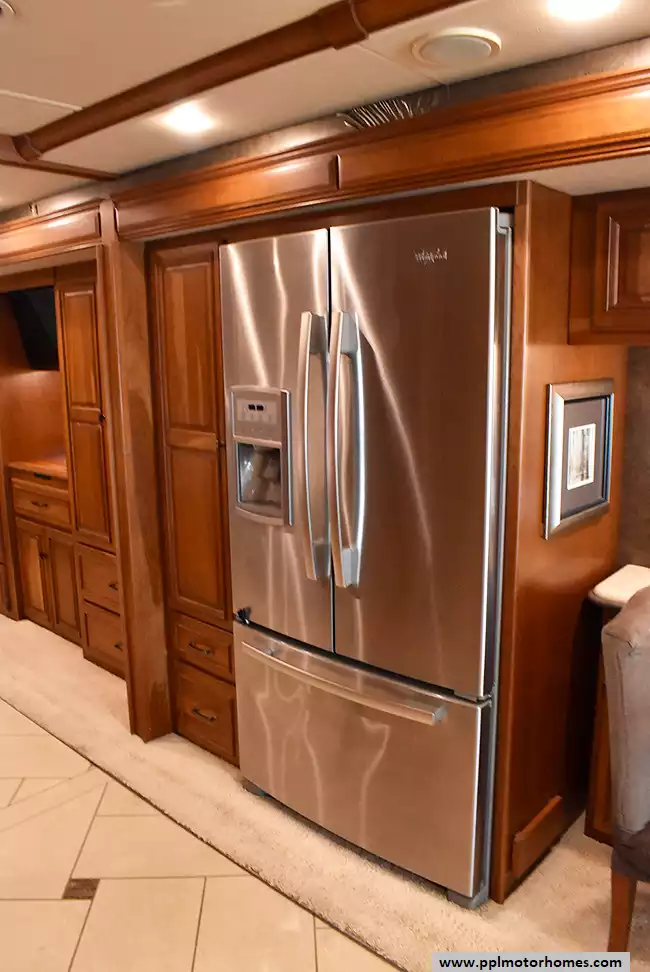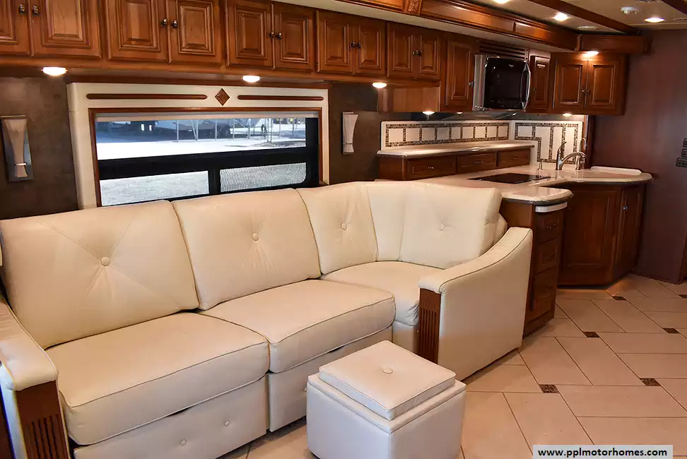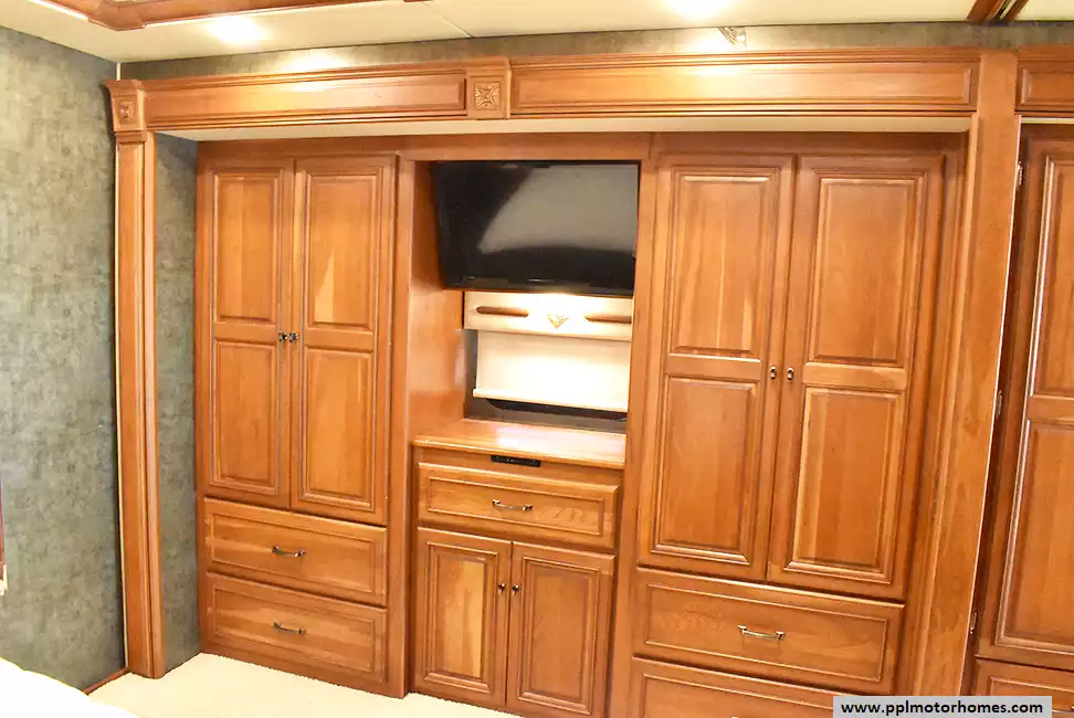 Enjoy the comfort of triple slide-outs, including a full-wall slide for maximum living space. Additional highlights include a 10kW Onan diesel generator, automatic leveling, and an exterior entertainment center.