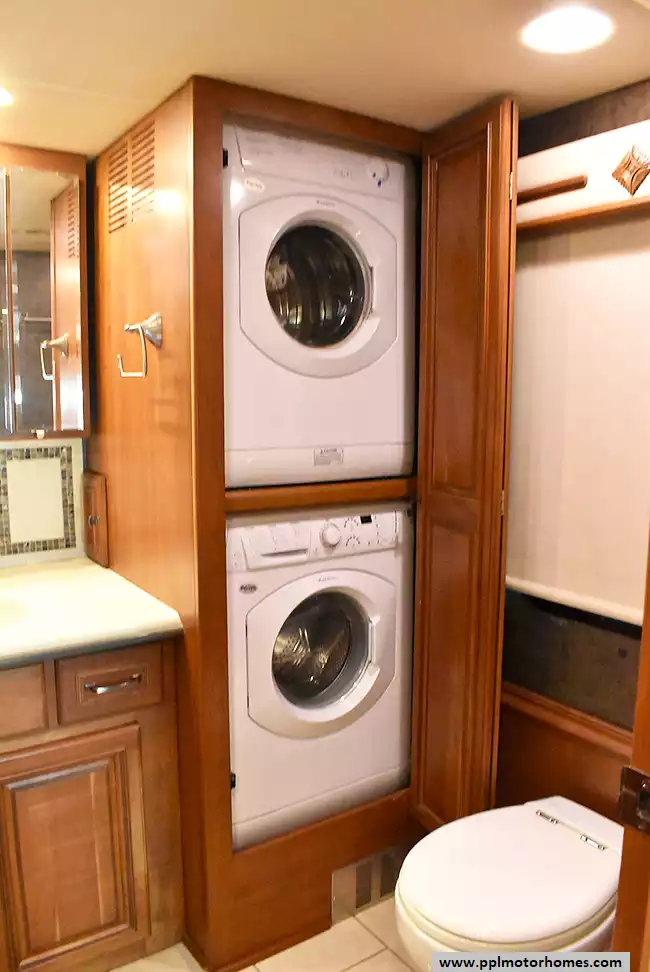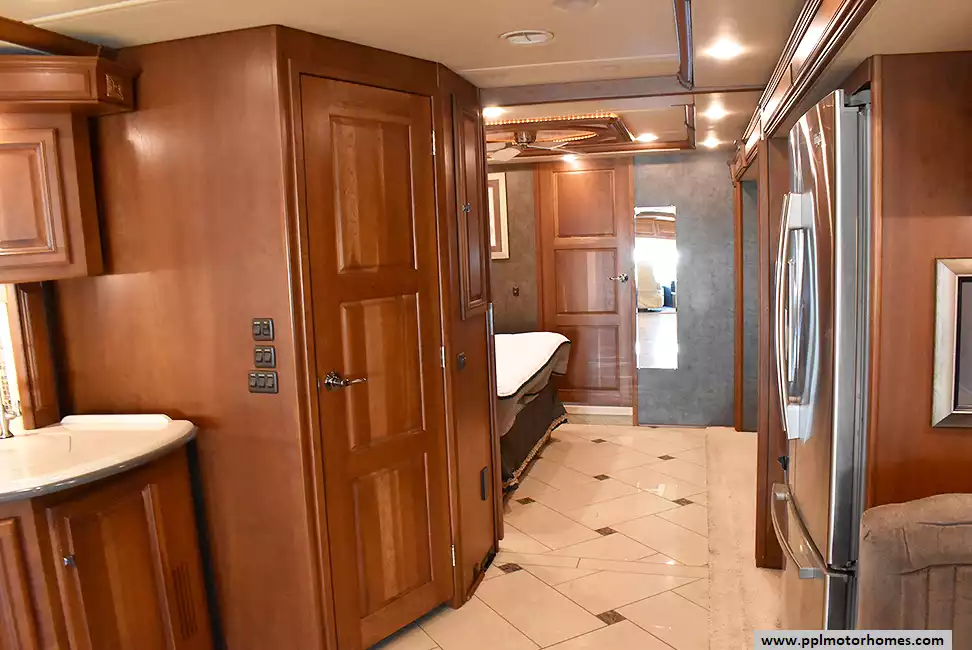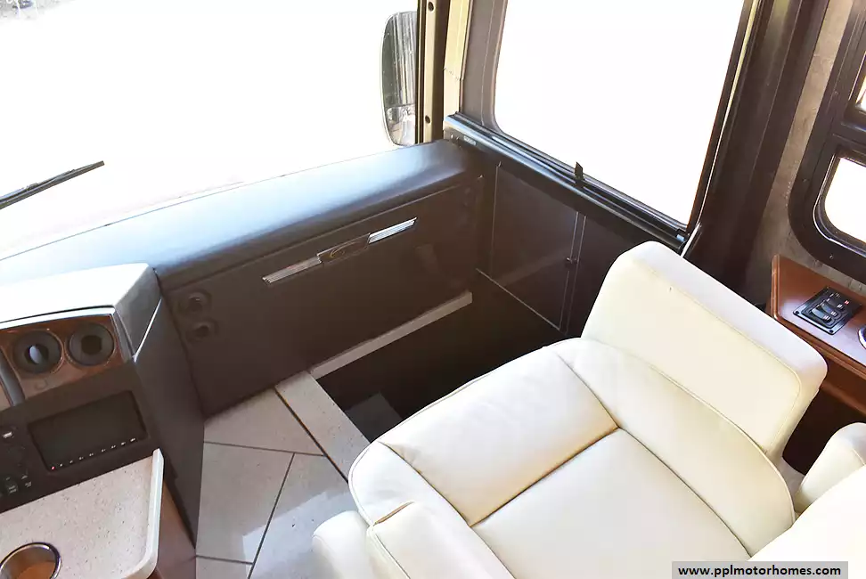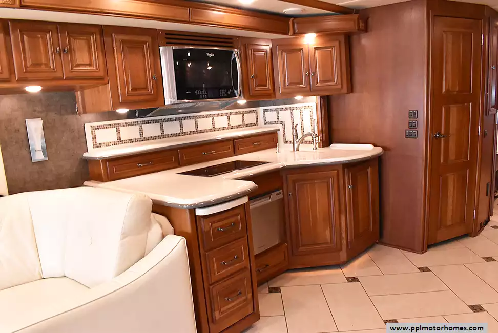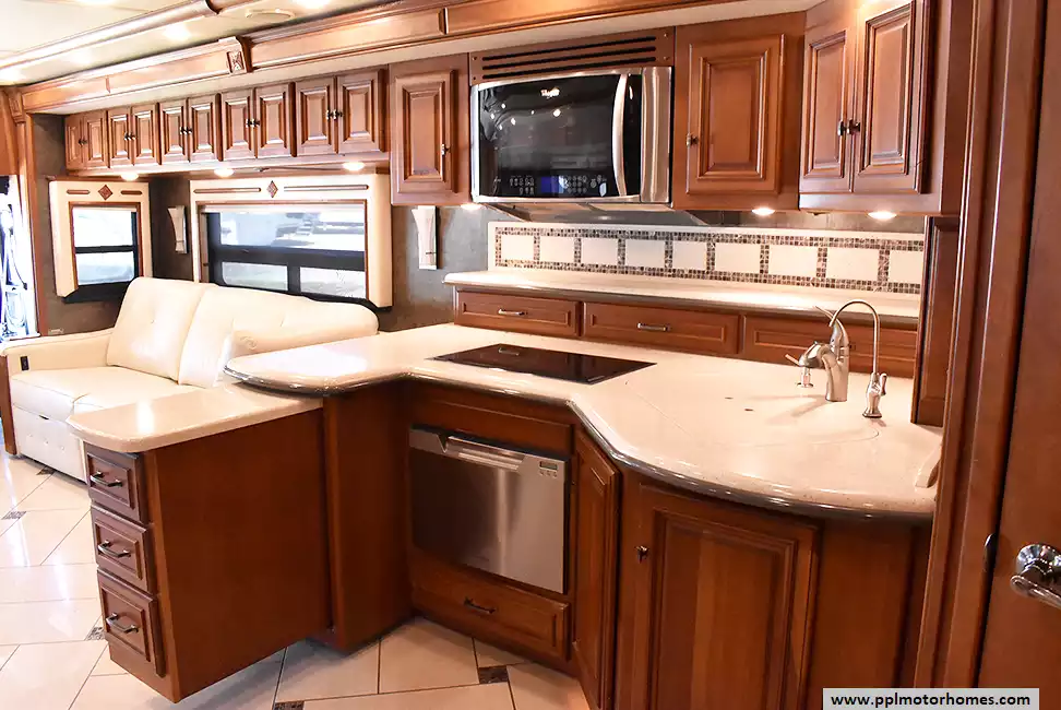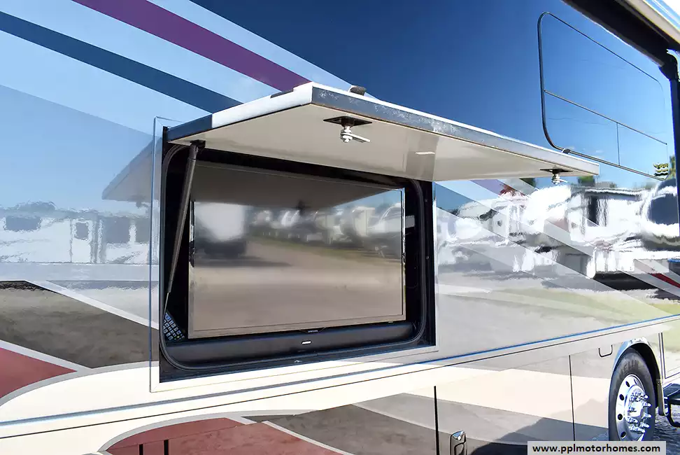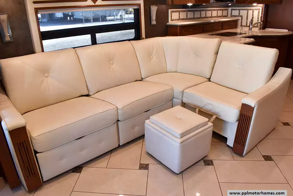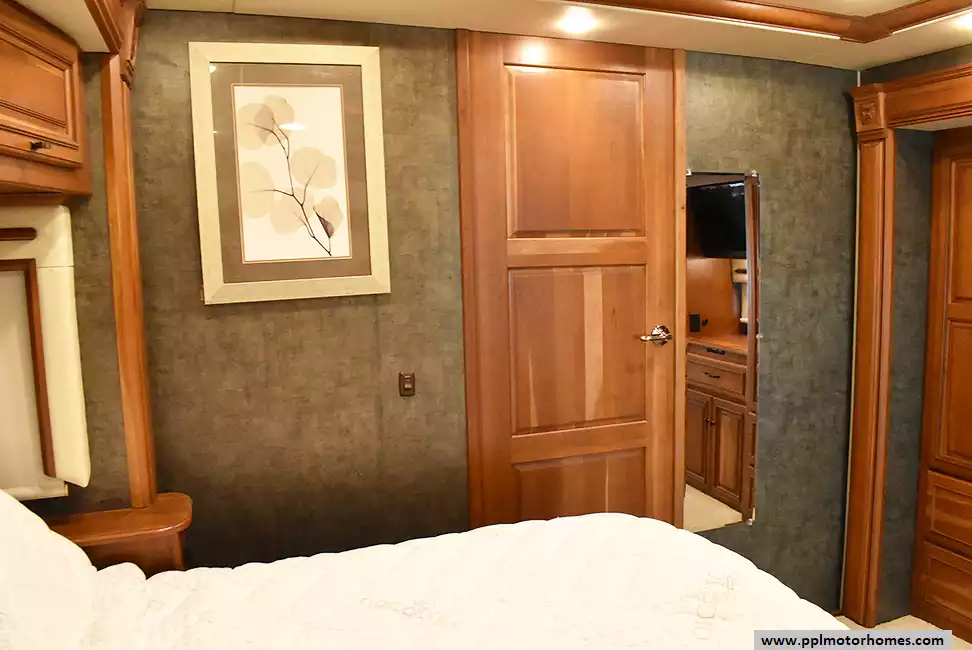 Enjoy the comfort of triple slide-outs, including a full-wall slide for maximum living space. Additional highlights include a 10kW Onan diesel generator, automatic leveling, and an exterior entertainment center.