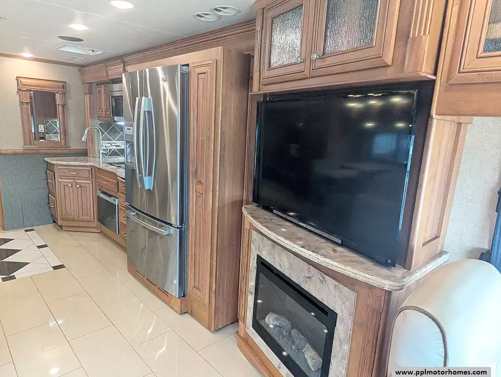 The interior is a masterpiece of comfort, featuring high-end amenities that make it a true home on wheels. The gourmet kitchen is fully equipped with a residential Whirlpool refrigerator and in-fridge ice maker, a dishwasher, a convection microwave, and a two-burner range. After a day of exploring, you can relax by the warm glow of the built-in fireplace or enjoy one of the three interior TVs, supported by a satellite receiver. Modern conveniences are found in every corner, including a central vacuum system, a stackable washer/dryer, and heated tanks for four-season travel. Outside, the living space expands with an automatic main awning and a full suite of window, slide, and door awnings, all complemented by an exterior entertainment system and an outside shower. Complete with a backup camera and automatic levelers for effortless setup, this Tuscany 42WX is ready to provide a first-class experience wherever the road leads.