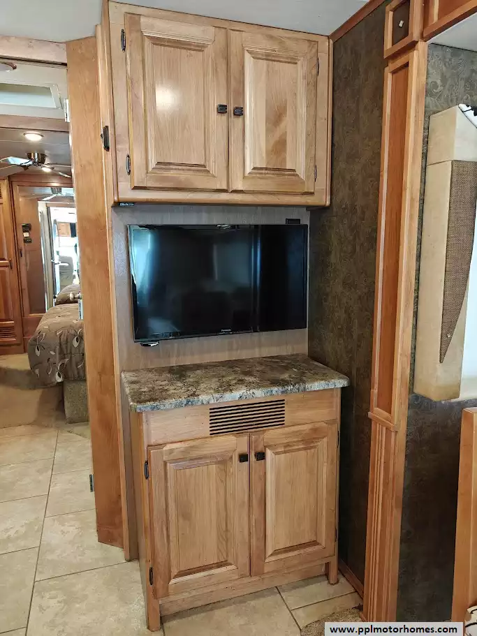 The 2014 Tiffin Allegro RED 36QSA is a 36-foot Class A diesel motorhome known for its quality build, spacious four-slide-out floor plan, and reliable 340 HP Cummins engine on a Freightliner chassis. This coach features two captain's chairs that can rotate to face the living area. The living area includes a sofa bed, a recliner, a table with chairs and overhead cabinets for convenient storage. The kitchen is designed for functionality and features premium amenities, including solid-surface countertops and name-brand appliances such as a residential stainless steel Whirlpool 2 door refridgerator. It also has a large double-bowl sink, recessed 3-burner gas cooktop and an over the range microwave. The kitchen incorporates ingenious storage solutions, including a dedicated pantry next to the refrigerator and abundant overhead cabinets and stacked drawers below the counter. The main bedroom slide-out (driver's side) features a queen-size bed with nightstands and overhead cabinets.The opposite wall contains a bank of drawers and a TV. The rear wall provides a generous closet. A vanity and sink with overhead cabinets are tucked into one corner of the bedroom area.